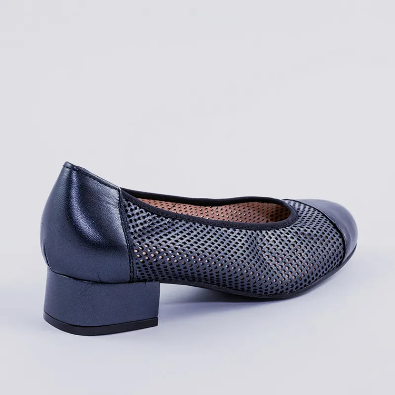 Salón de tacón bajo ROLDAN sección ANCHO ESPECIAL COMFORT para pies delicados fabricado en piel calada color AZUL ligeramente metalizada con puntera y talón sin perforar. Puntera redonda, ajuste de boca elástico, plantilla de piel y suela de goma.