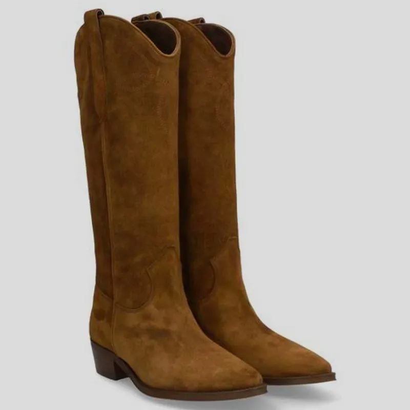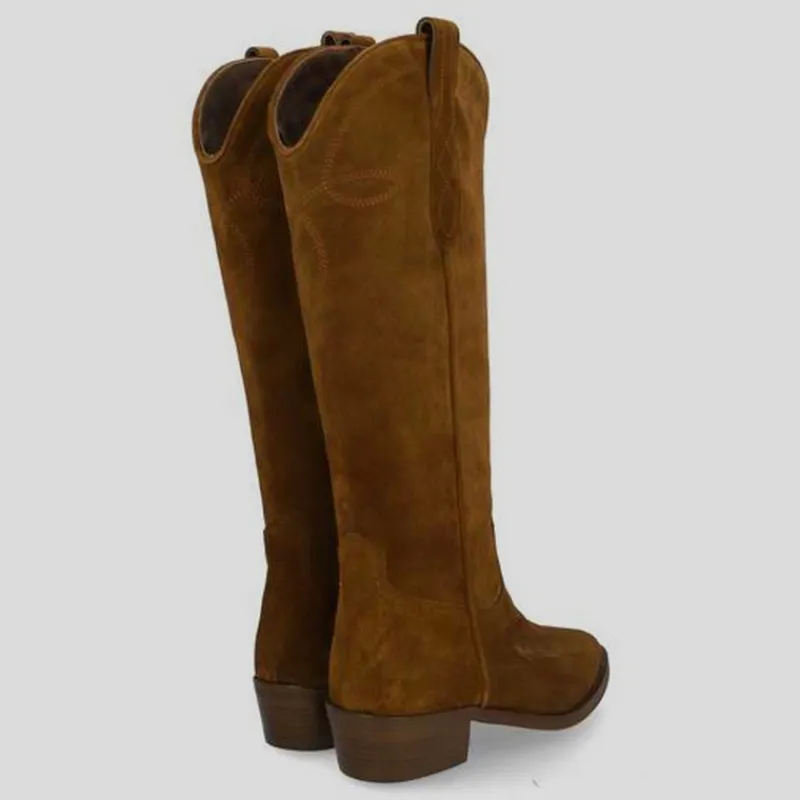 Bota campera de caña alta de ALPE en ante color CUERO con pala lisa y adorno bordado al tono en la caña. Detalle de trabillas laterales en la parte superior de la caña. Tacón bajo estilo cubano de 4 cm y suela antideslizante.