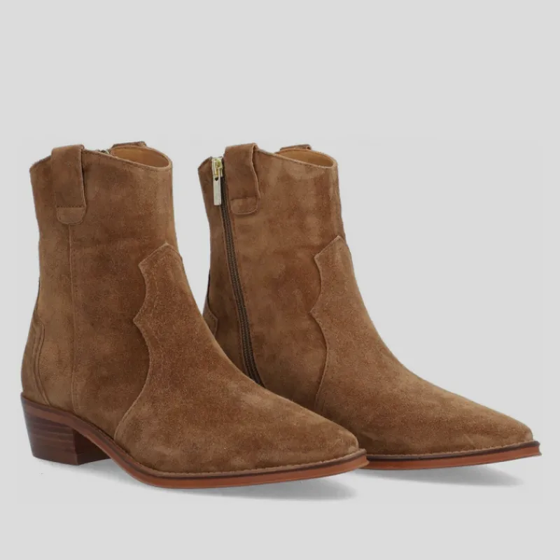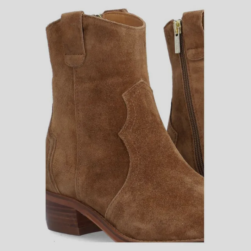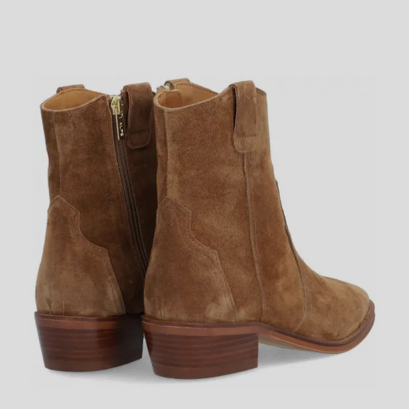 Botín campero de ALPE en ante color CUERO con puntera afilada y caña baja. Tacón bajo estilo cubano de 4 cm. Cierre por cremallera en lateral interior. Plantilla de piel acolchada y forro interior de antelina. Suela sintética antideslizante.