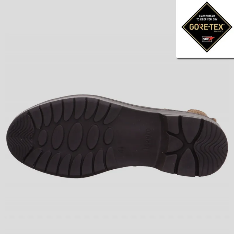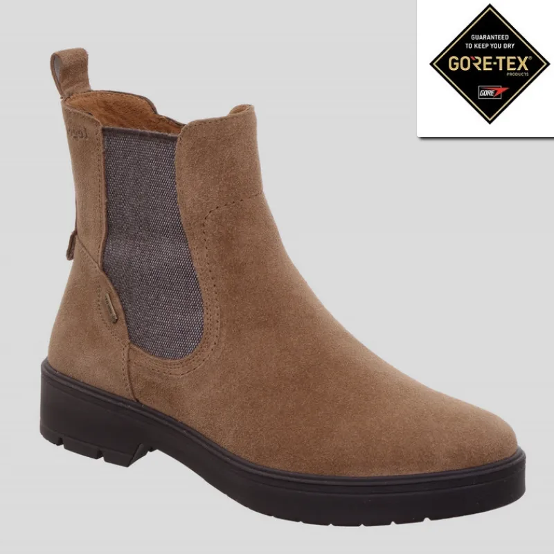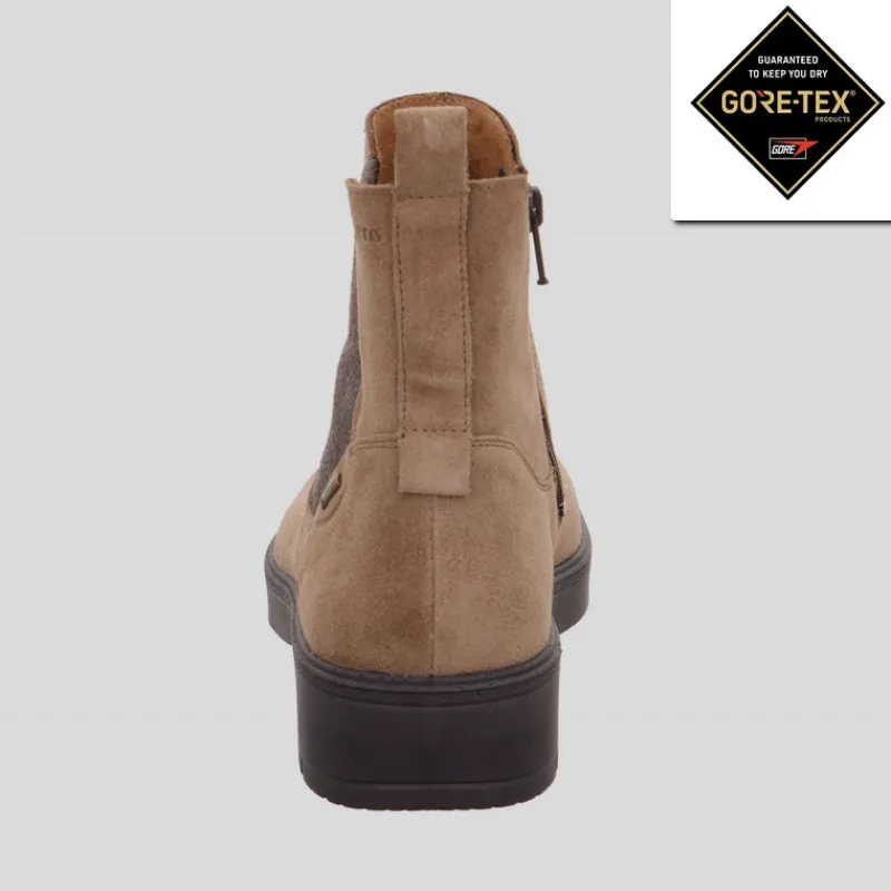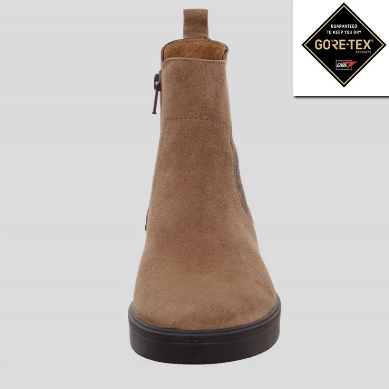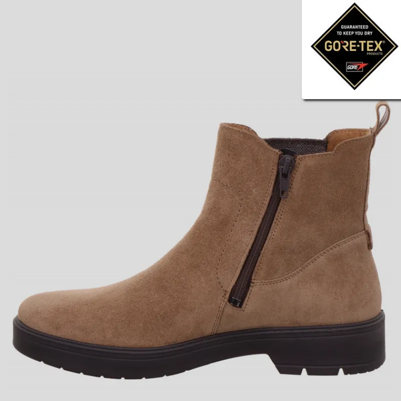 Botín de mujer con tacón plano de LEGERO en ante CAMEL con membrana interna de GORE-TEX que es impermeable y transpirable. Botines ligeros y flexibles en piel nobuck con elástico en el exterior y cierre por cremallera en lateral interior. Suela antideslizante.