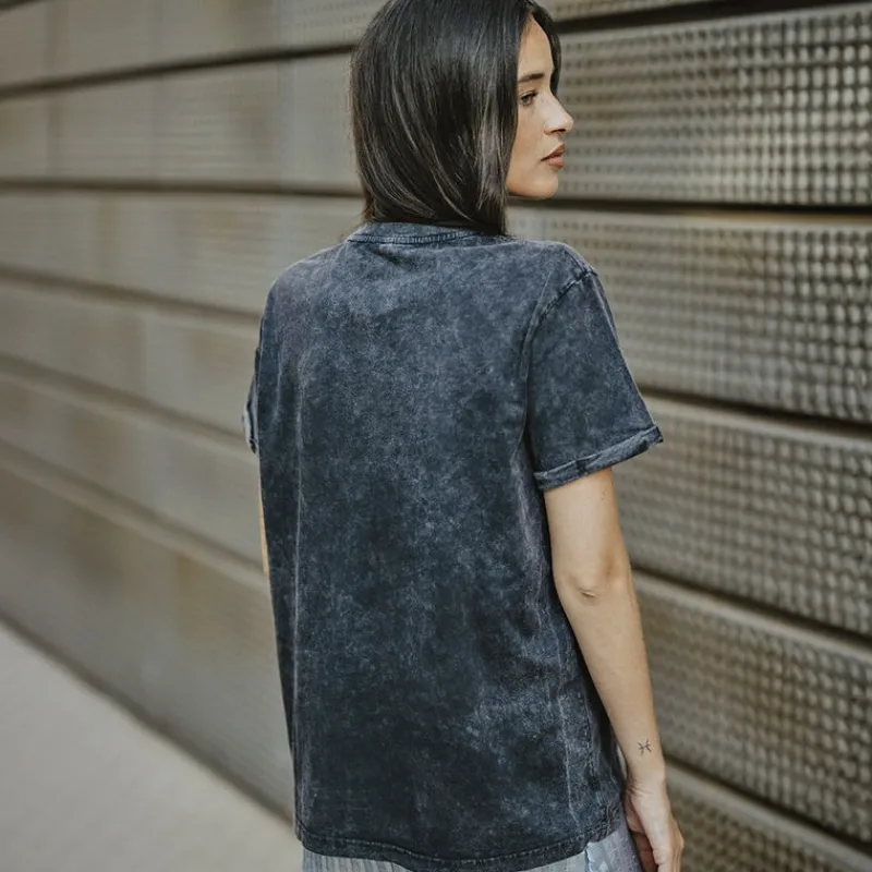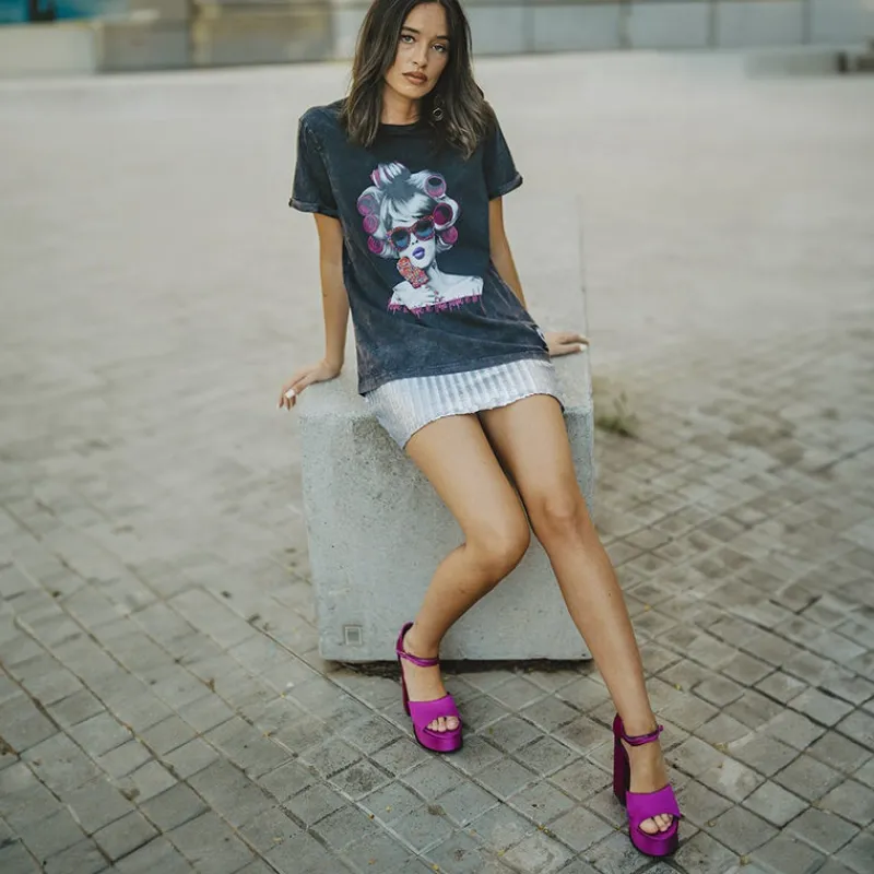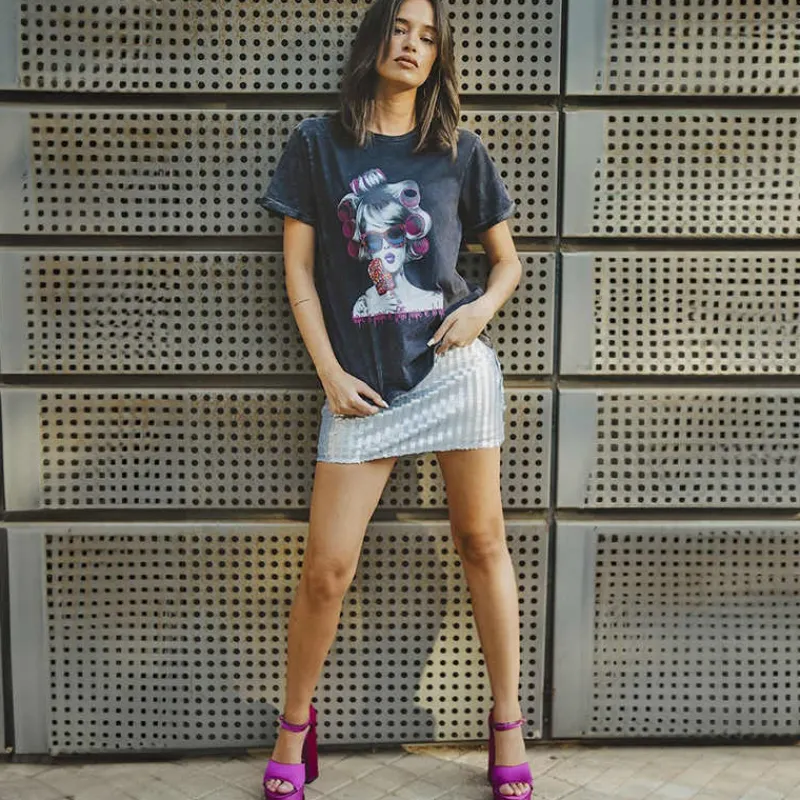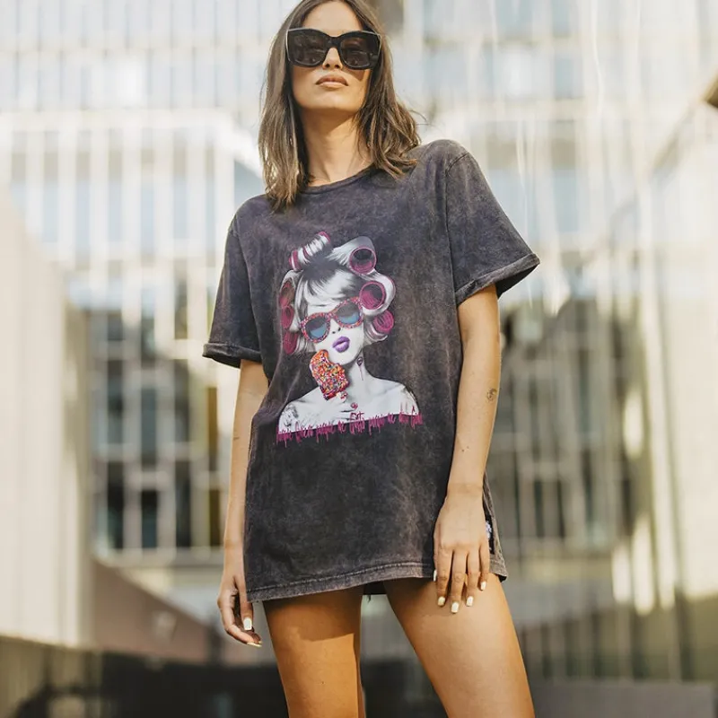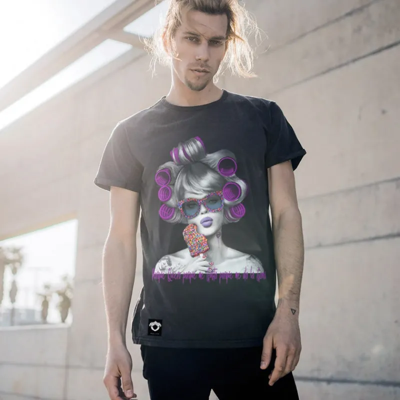 Camiseta UNISEX de BE HAPPINESS modelo SOPHIA CRAZY CURLS en 100% Algodón (170 g) color NEGRO FADE OUT (Desgastado). Manga corta con dobladillo. Cuello redondo. Ilustración digital en parte delantera. Regular fit. Técnica efecto lavado fade out negro.