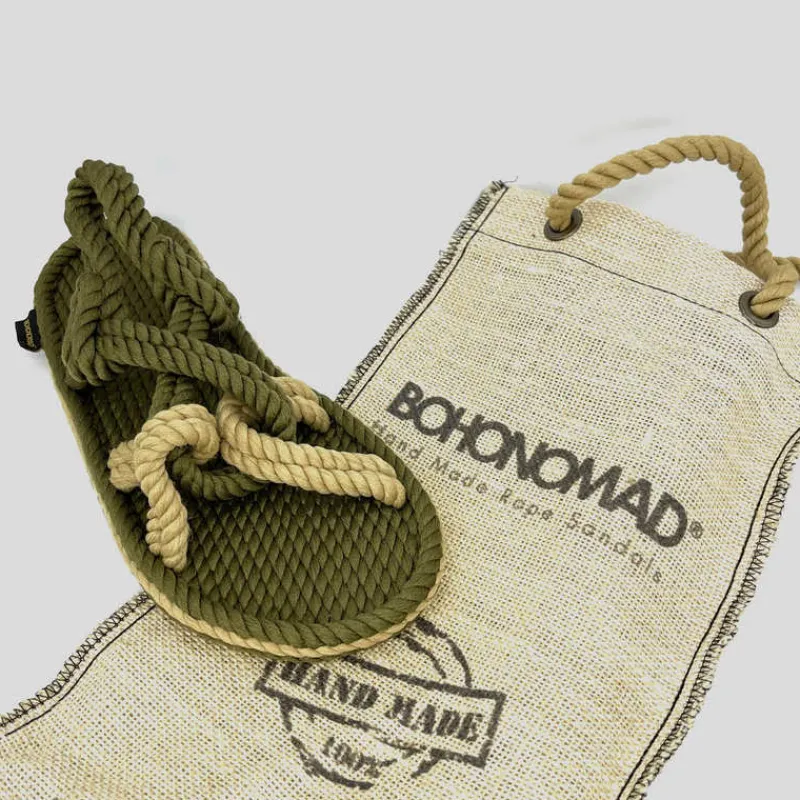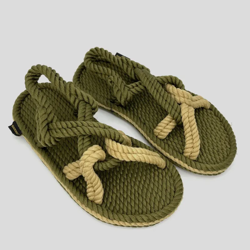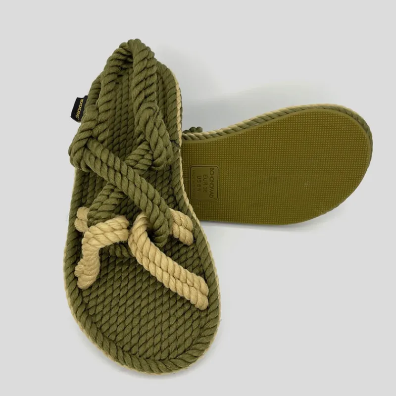Sandalia plana de BOHONOMAD modelo BORA BORA confeccionada en cuerda BICOLOR KAKI y BEIGE. Suela de caucho natural. 100% Hechas a mano. Veganas, ecológicas y reciclables.Antibacterianas. Resistentes al agua salada y al cloro, por lo que no se desgastan.