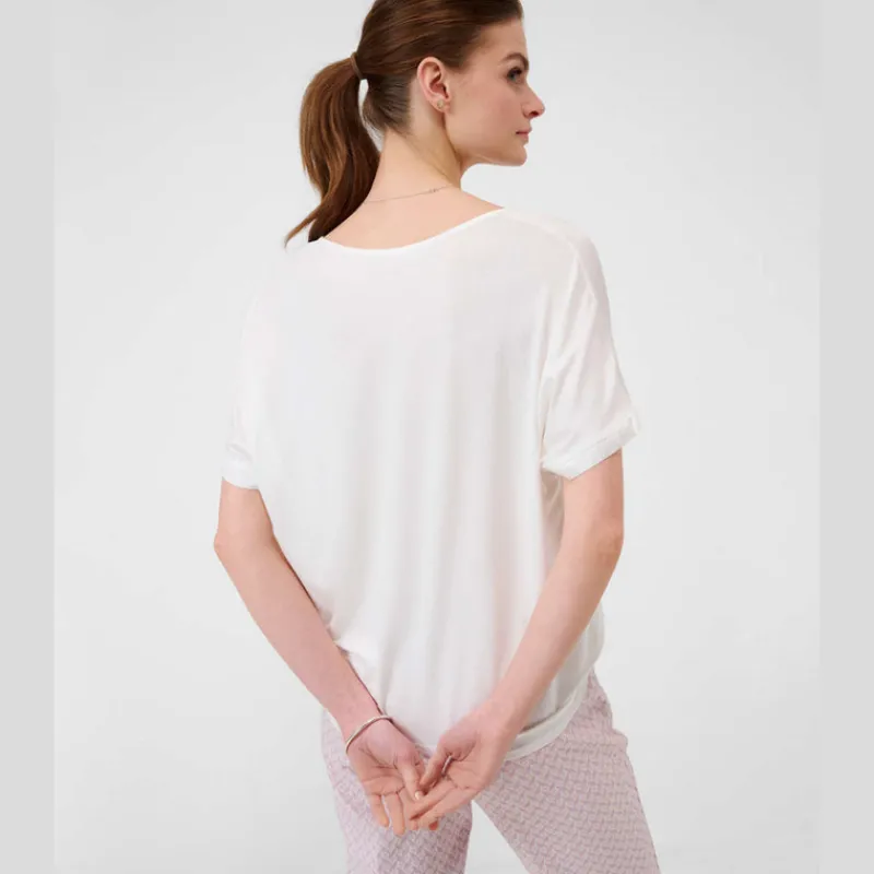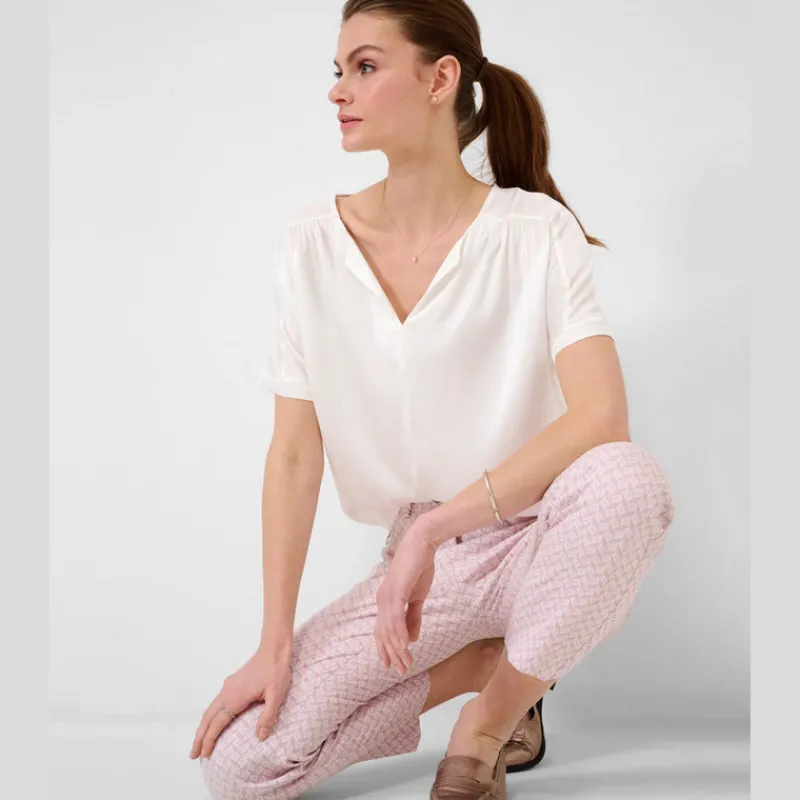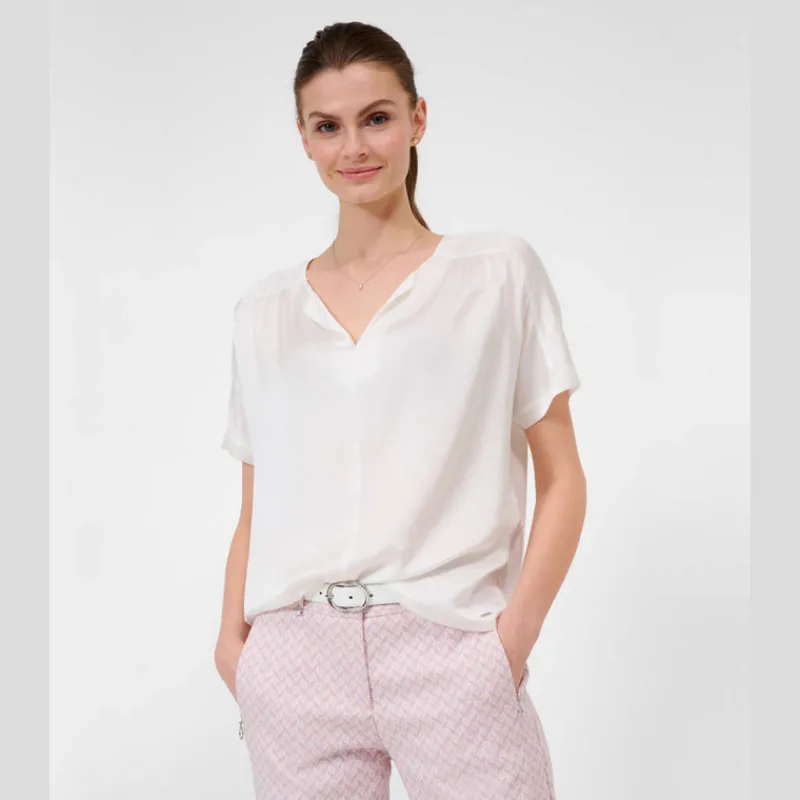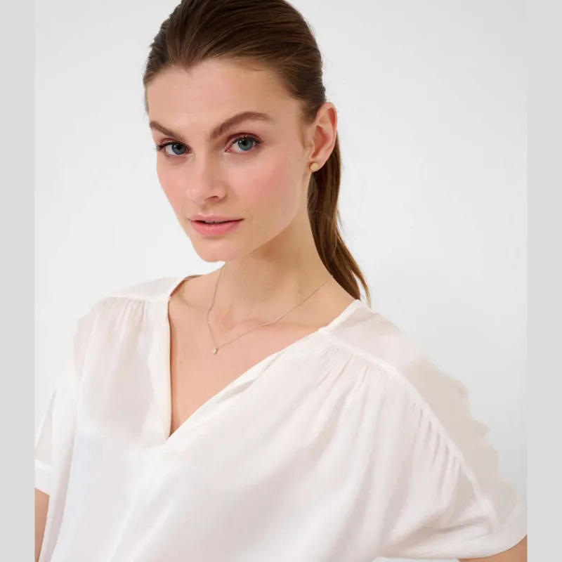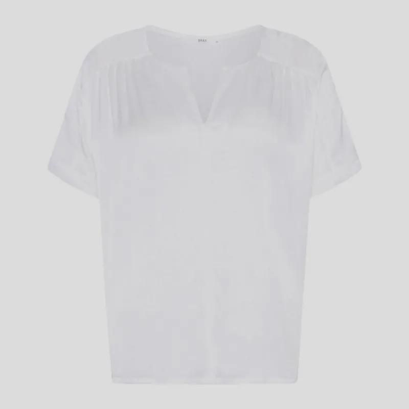 Top BRAX FEEL GOOD modelo CAELEN fabricado en combinación de texturas color BLANCO. Frontal en viscosa con textura en brillo tipo seda y espalda en mezcla de viscosa elástica. Cuello SERAFIN, redondo con escote en V y manga corta con fruncido en hombros.