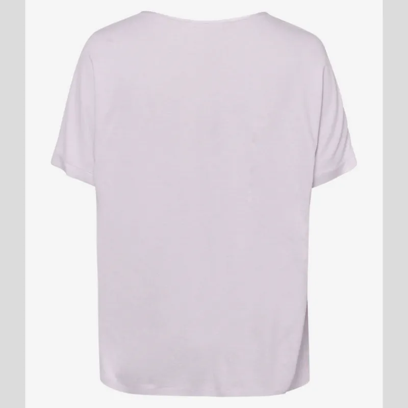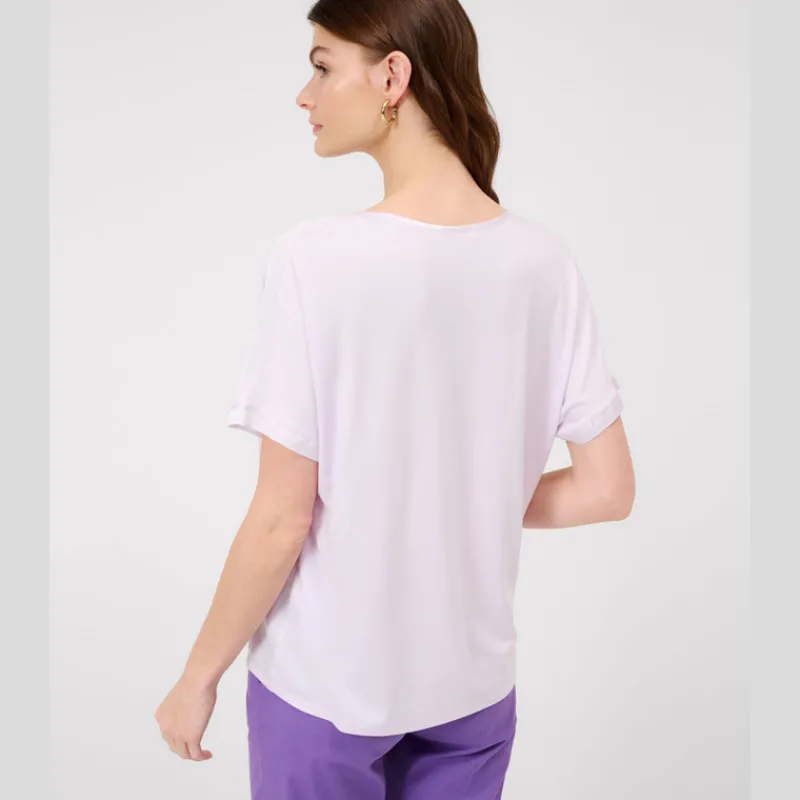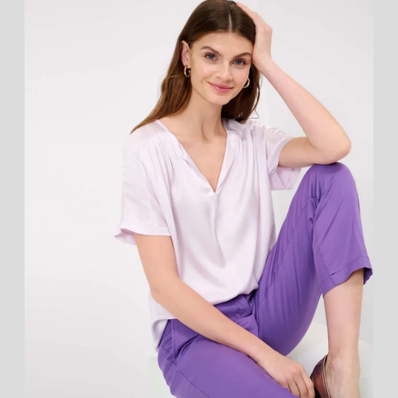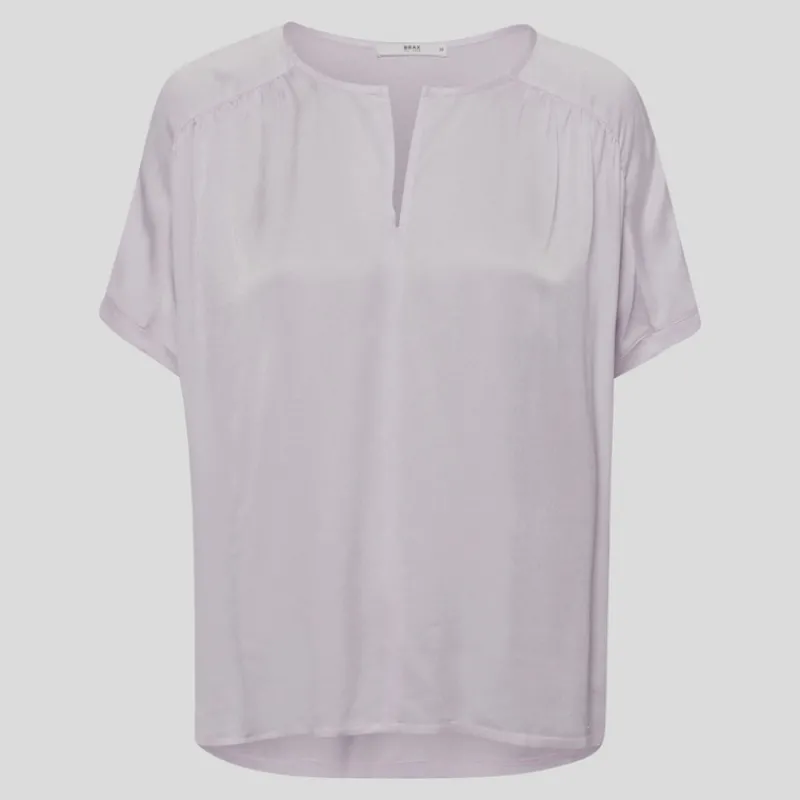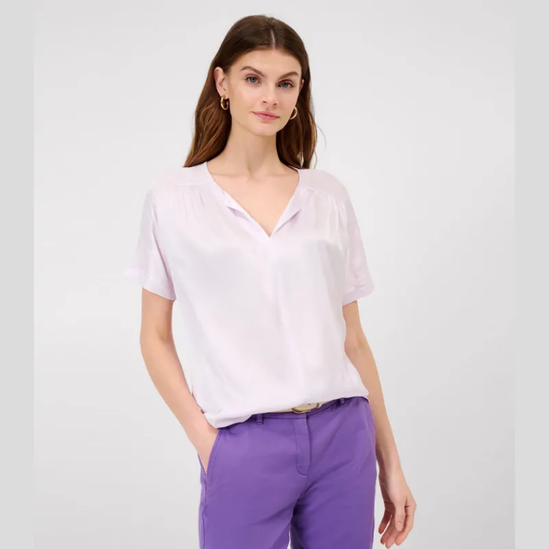 Top de BRAX FEEL GOOD modelo CAELEN fabricado en combinación de texturas color LILA. Frontal en viscosa con textura en brillo tipo seda y espalda en mezcla de viscosa elástica. Cuello SERAFIN, redondo con escote en V y manga corta con fruncido en hombros.