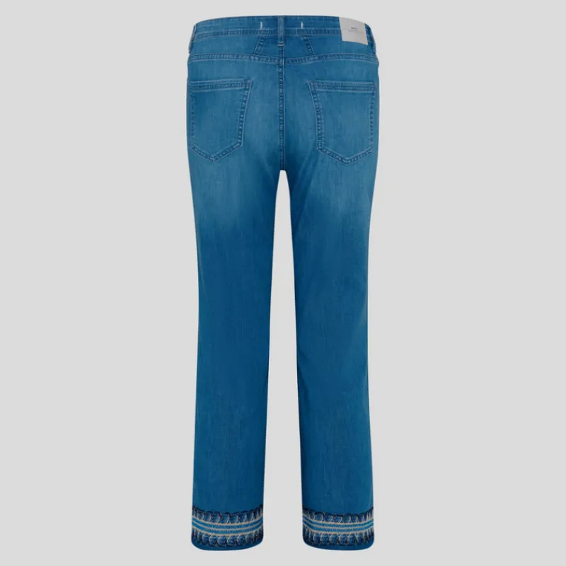 Jeans BRAX FEEL GOOD modelo MARY en denim elástico ULTRALIGHT color TEJANO GASTADO. Estilo Regular Bootcut con corte acampanado y cintura estándar. Dobladillo con detalle de cinta de cenefa en bordado. Lleva cinco bolsillos. Cierre con cremallera y botón.