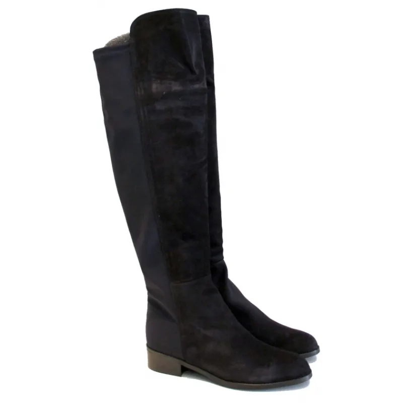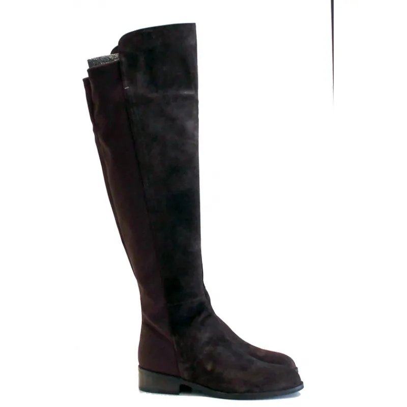 Bota alta tipo mosquetera en tono marrón de la marca PLUMERS de MENORCA en ante combinado con licra en su parte trasera y tacón bajo de unos 2 centímetros