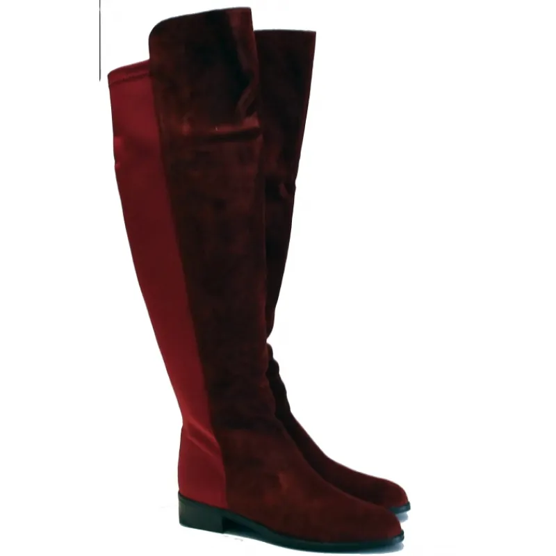 Bota alta tipo mosquetera en tono marrón de la marca PLUMERS de MENORCA en ante combinado con licra en su parte trasera…