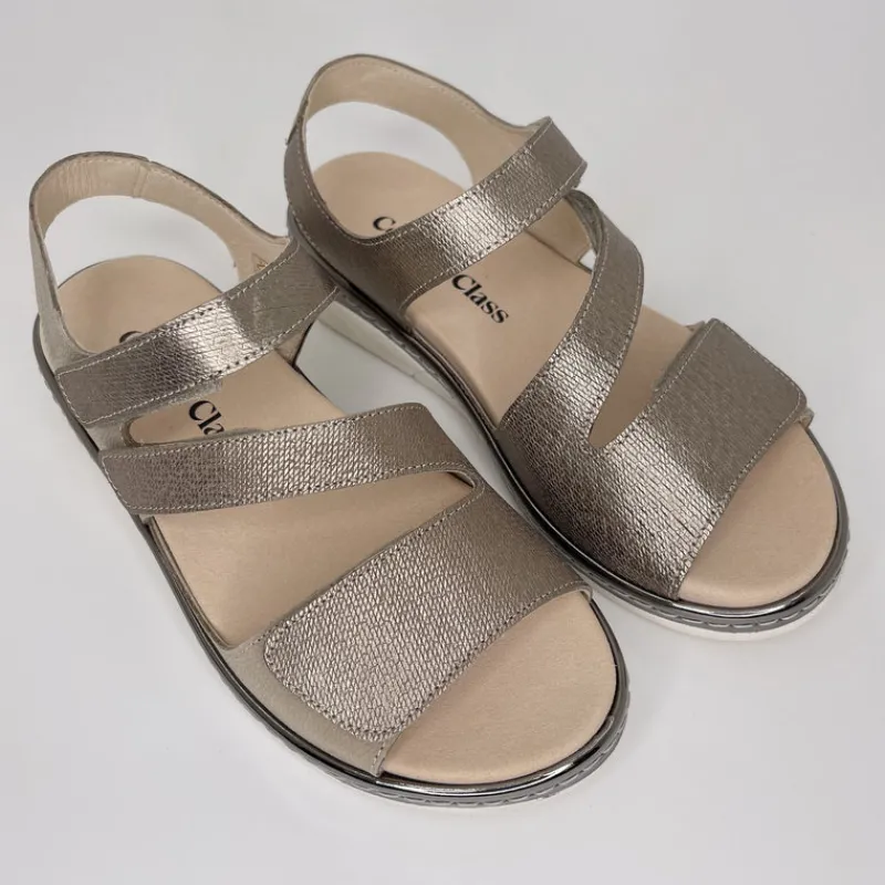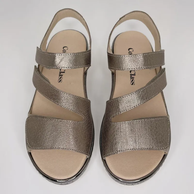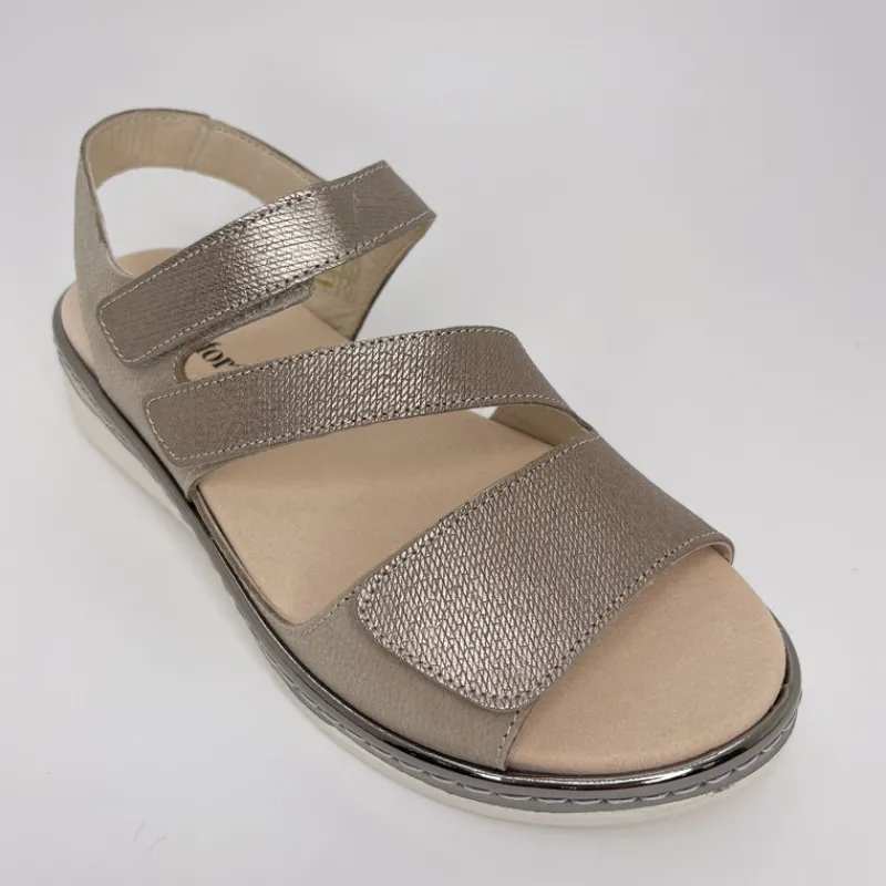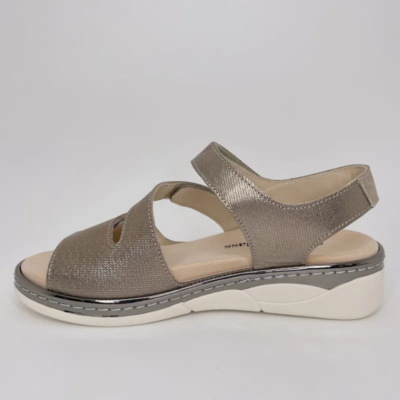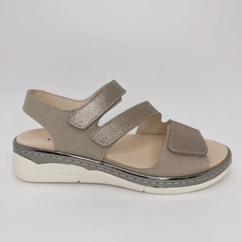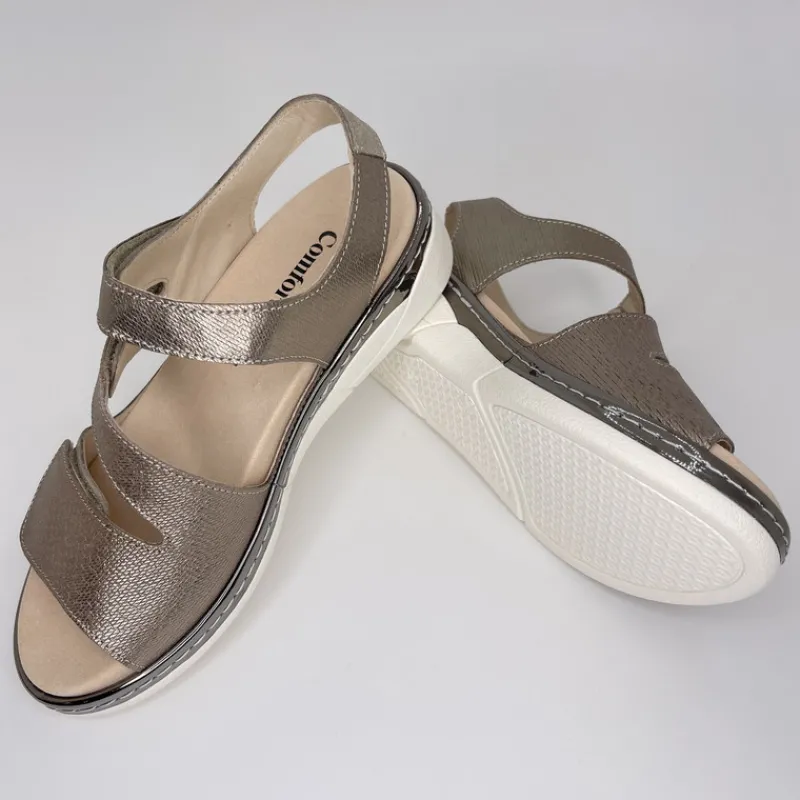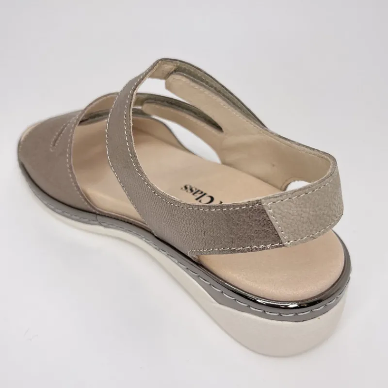 Sandalia con CUÑA BAJA de nuestra sección «Anchos Especiales» COMFORT CLASS color TAUPE mitad nobuk y mitad piel grabada. Detalle metalizado plata en la cuña. Ajuste por velcro en las tres tiras delanteras. PLANTILLA EXTRAÍBLE ACOLCHADA. Suela Flexible.