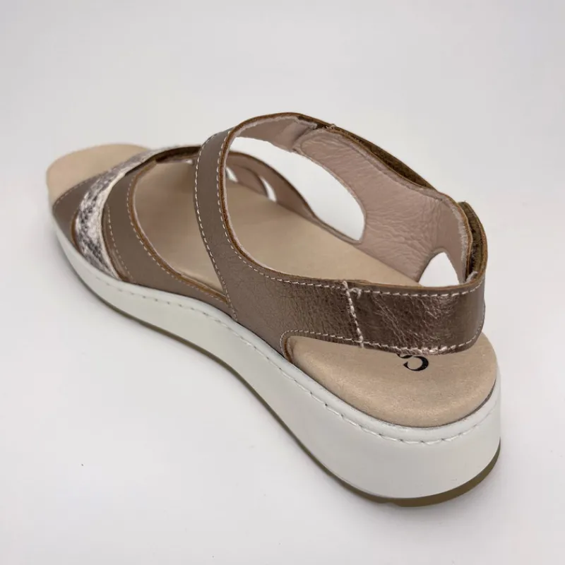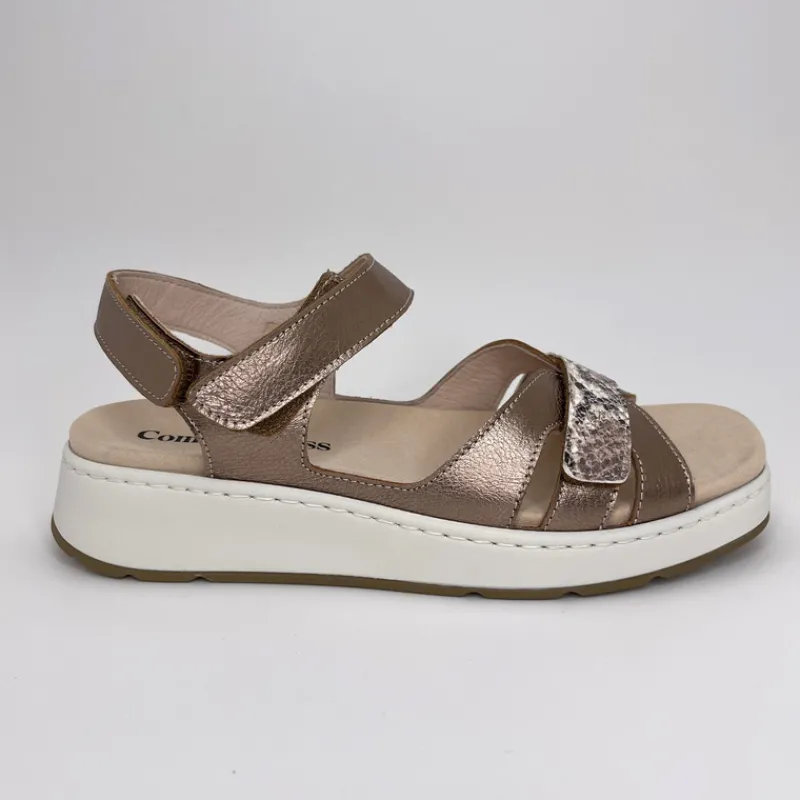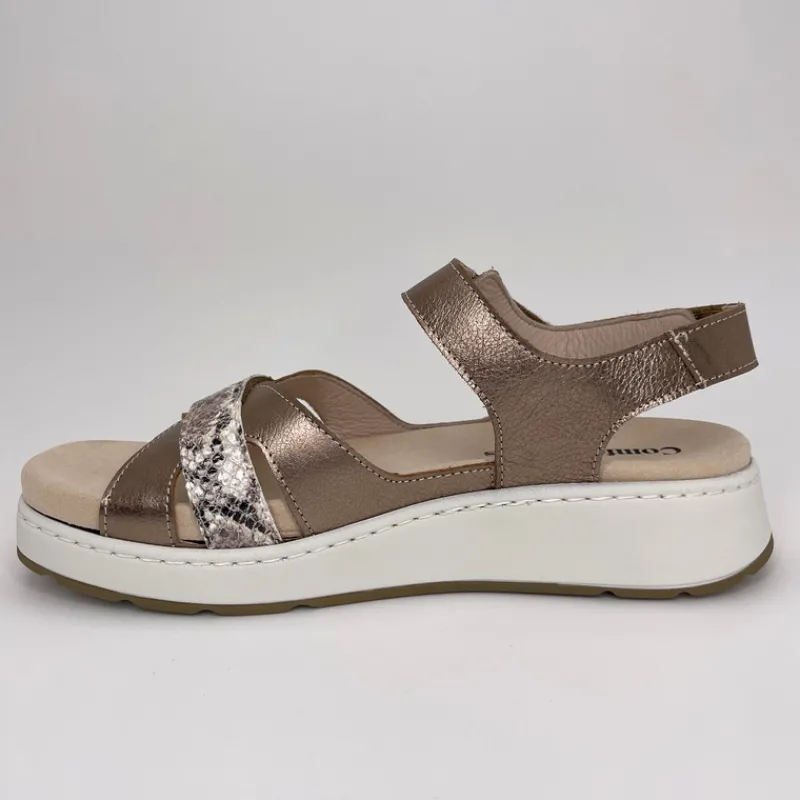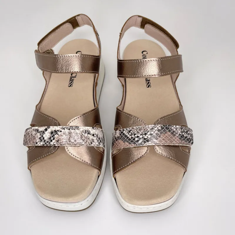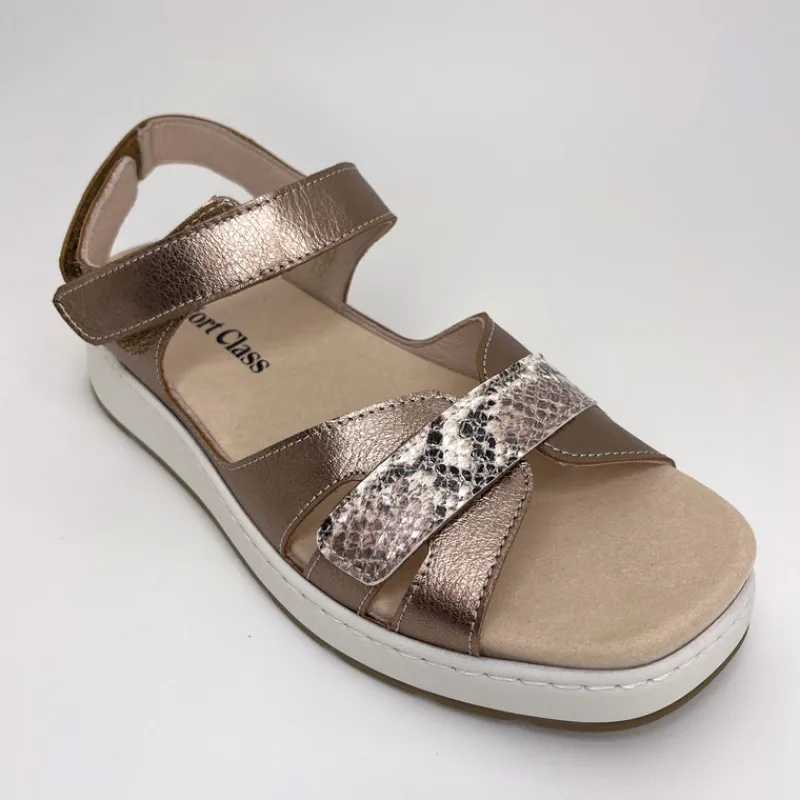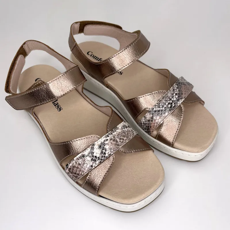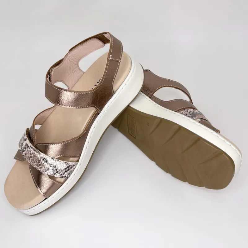 Sandalia con cuña de nuestra sección «Anchos Especiales» COMFORT CLASS en piel metalizada NUDE con detalle en PITÓN. Triple ajuste por velcro: en las tiras de la pala y en la tira de tobillo. PLANTILLA EXTRAÍBLE ACOLCHADA. Suela Flexible.