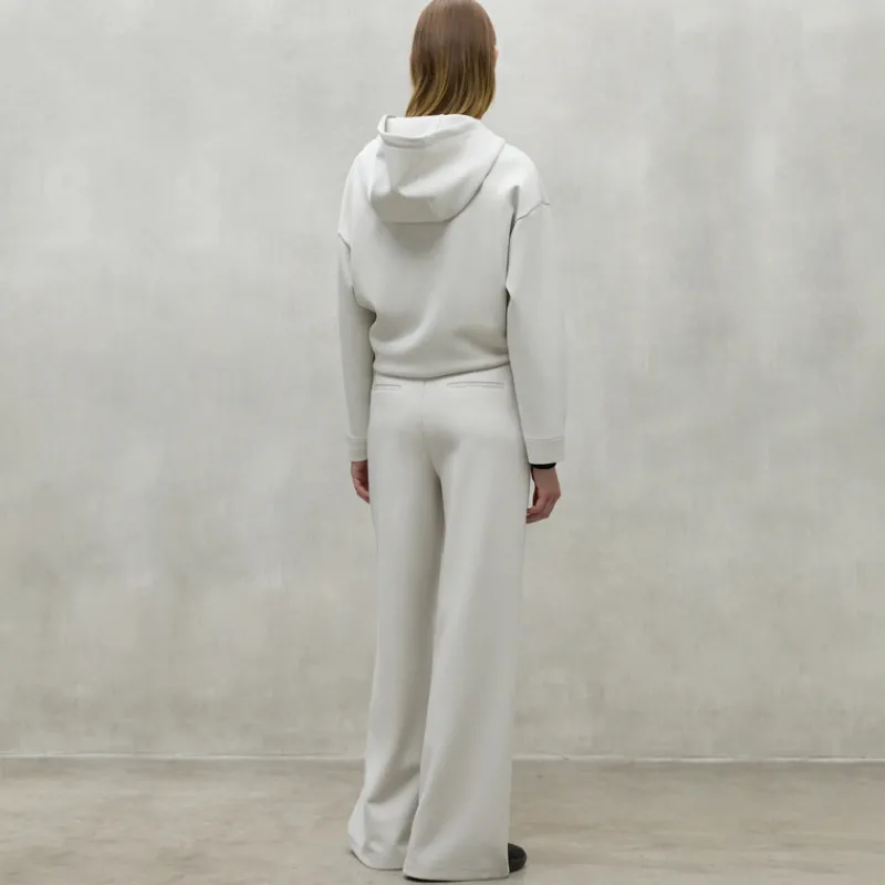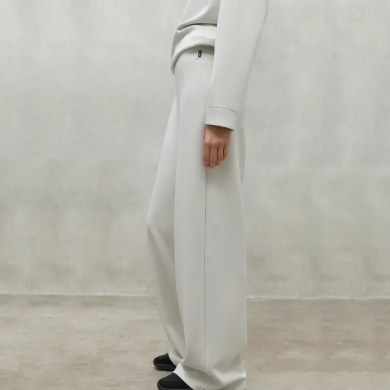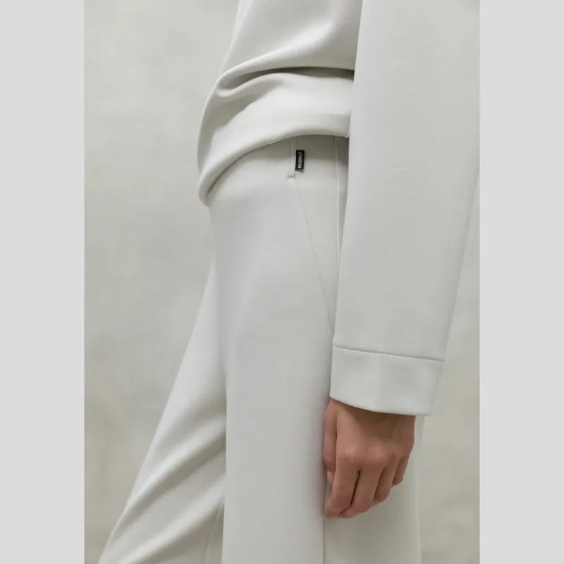 Pantalón vegano de ECOALF modelo ARDA color BLANCO CRUDO confeccionado en mezcla de fibras de POLIÉSTER RECICLADO, LENZING ECOVERO y ELASTANO. Corte PALAZZO con pierna ancha y cintura ajustable con banda elástica. Bolsillos delanteros y traseros falsos.