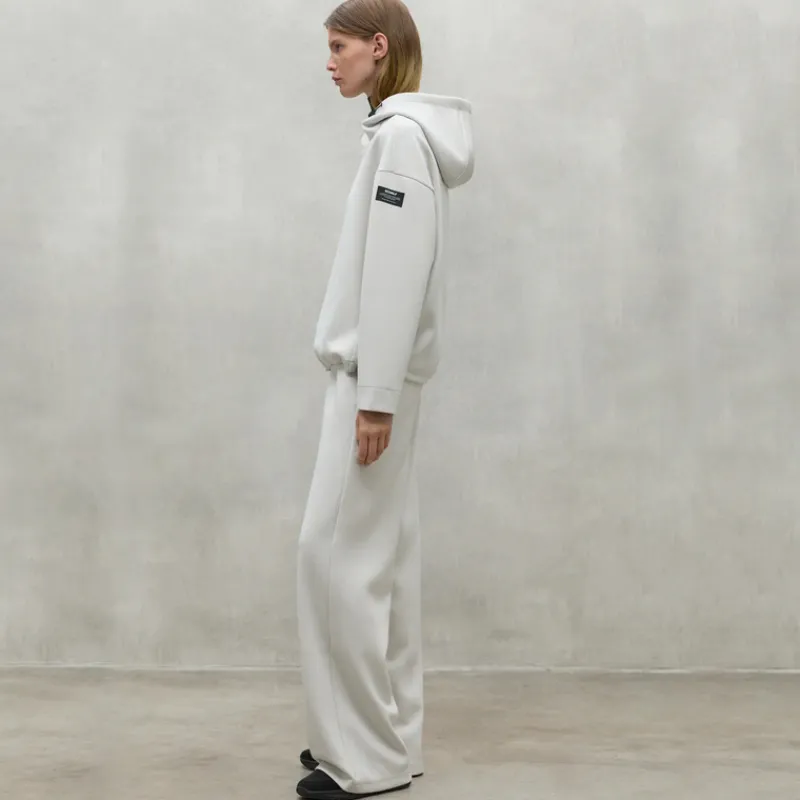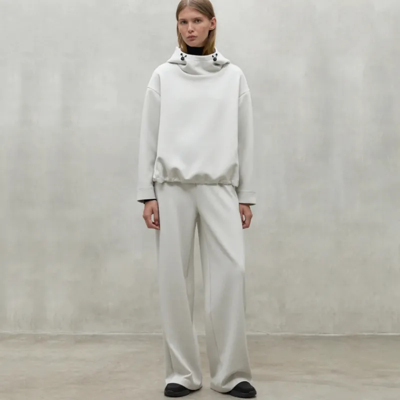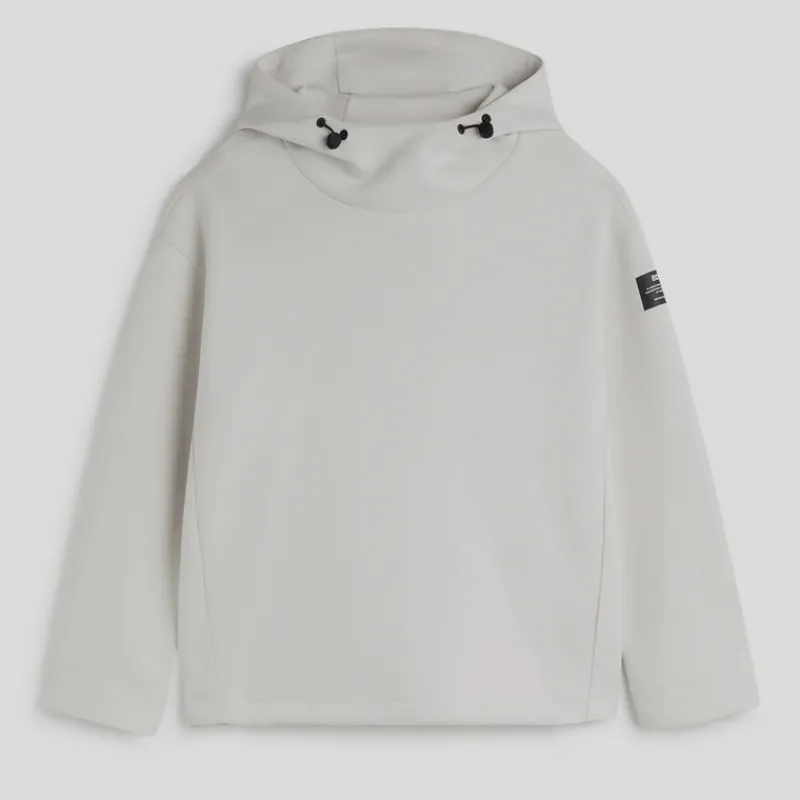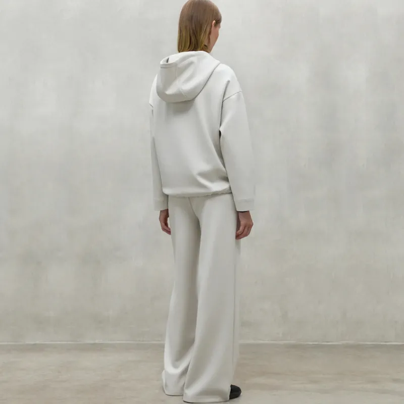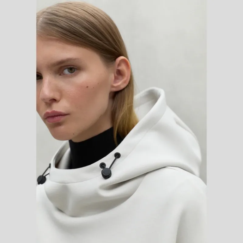 Sudadera vegana de ECOALF modelo CANCUN color BLANCO ROTO confeccionada en mezcla de fibras de POLIÉSTER RECICLADO, LENZING ECOVERO y ELASTANO. Corte holgado con hombros caídos. Lleva capucha y cintura ajustables por elásticos ocultos con topes.