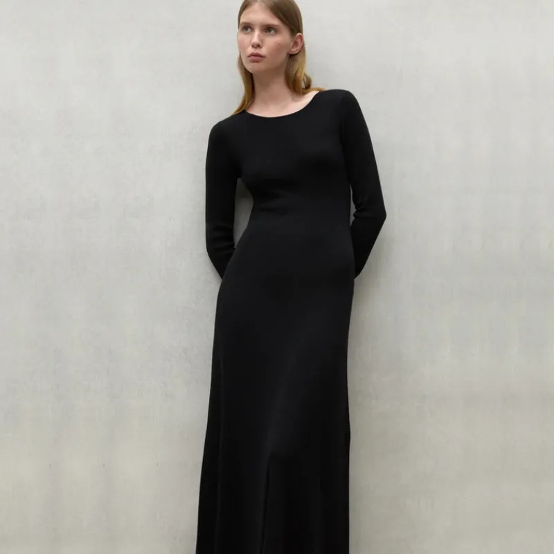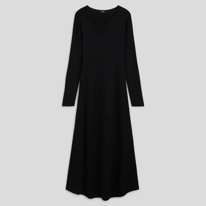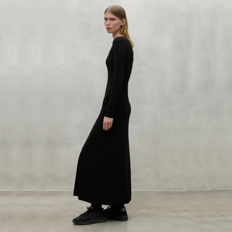 Vestido largo ECOALF modelo IRISN color NEGRO confeccionado en punto elástico mezcla de fibra TENCEL y ALGODÓN ORGÁNICO. Corte fit regular ajustado en cuerpo y acampanado en el bajo con amplio cuello redondo y manga larga. Vestido muy cómodo.