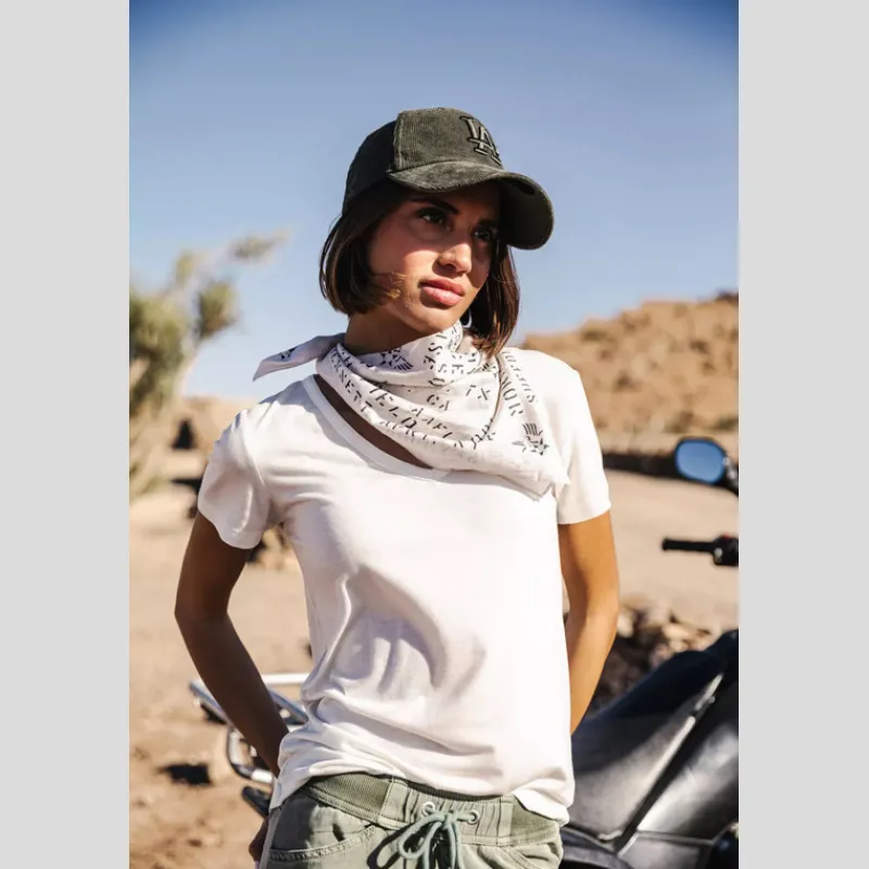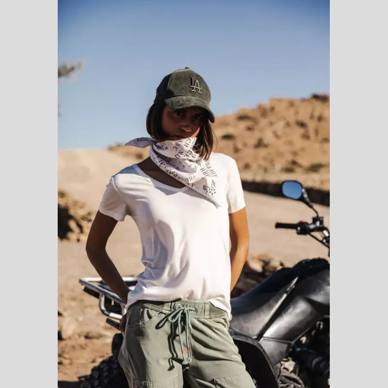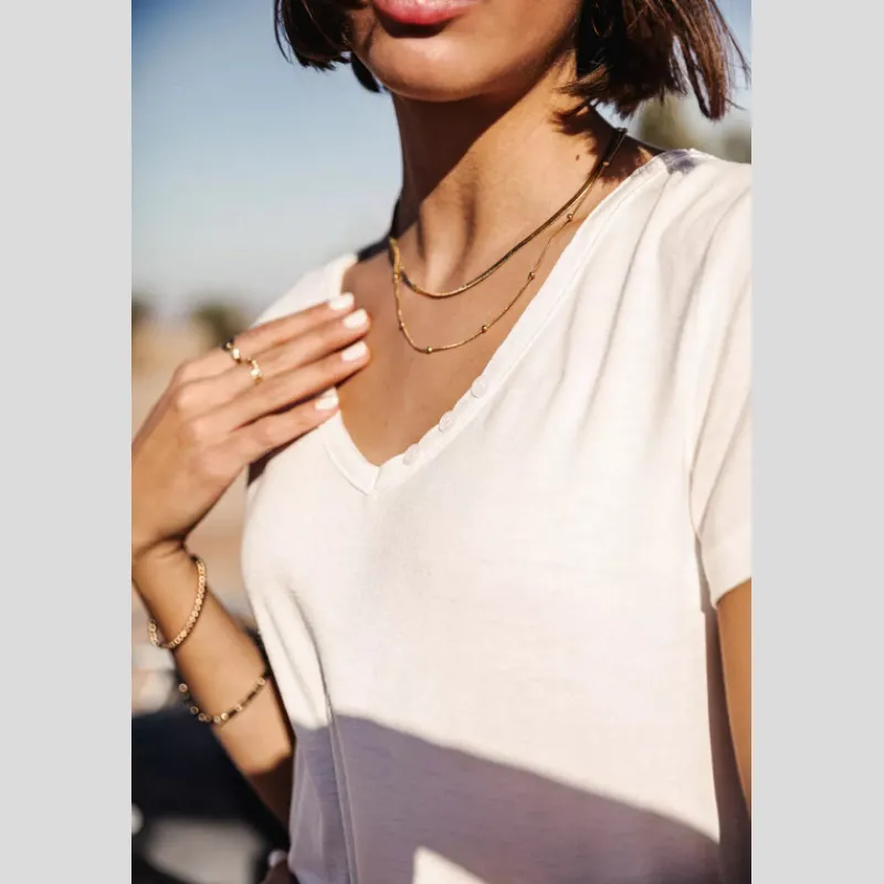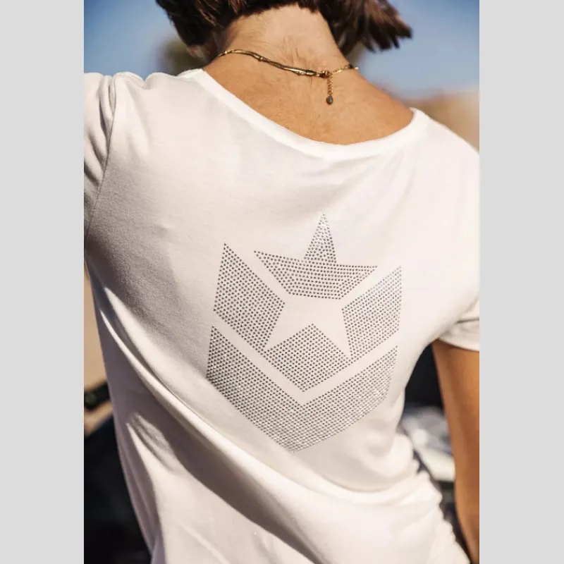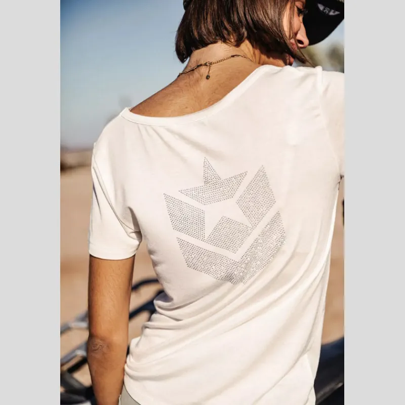 Camiseta de manga corta TARISSA ICON de FREEMAN T.PORTER en mezcla de rayón elástico color BLANCO con logo en pedrería de strass plata en la espalda. Lleva amplio cuello pico con efecto capas sin rematar y botones decorativos.