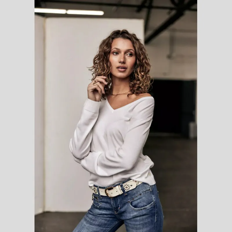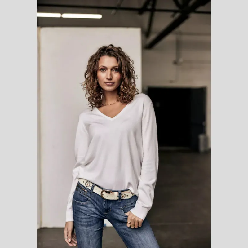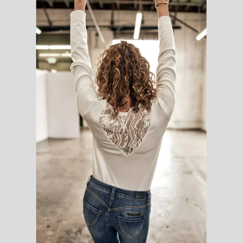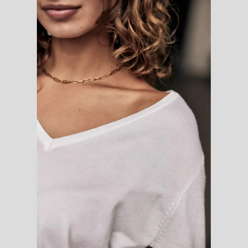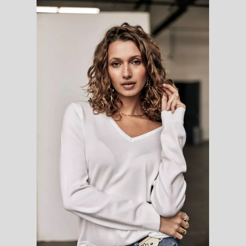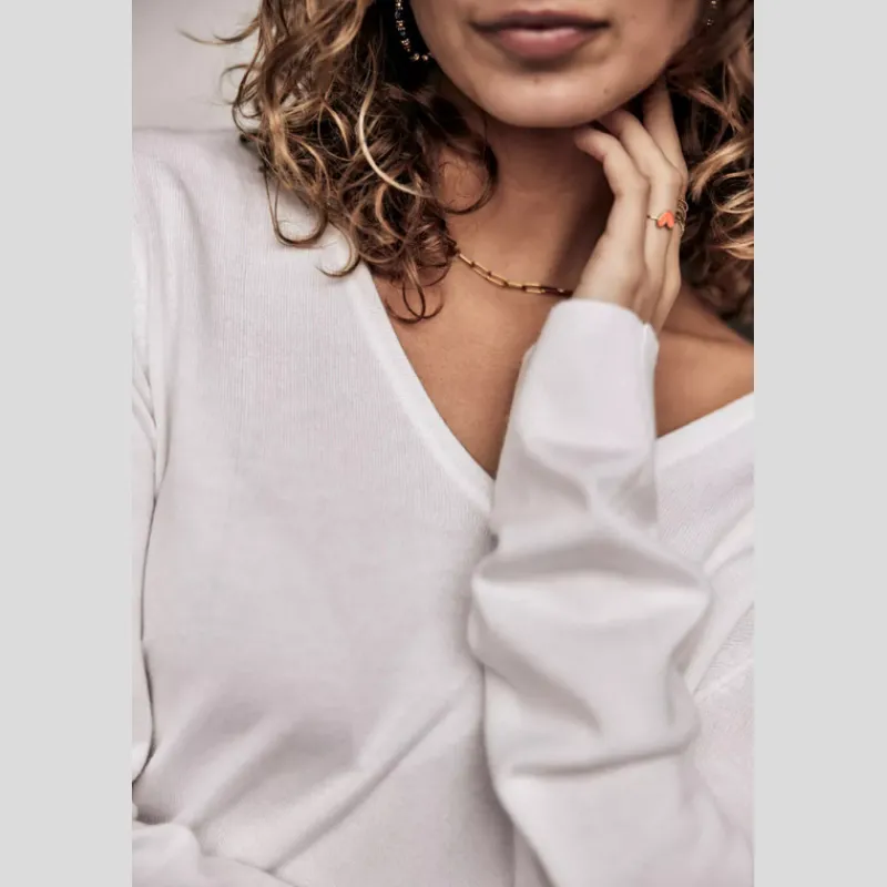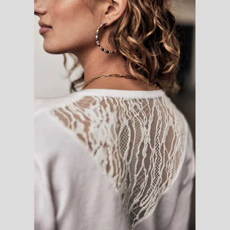 Suéter PARCIA LACE de FREEMAN T.PORTER de punto liso, suave y flexible color BLANCO. Manga larga. Escote en «V». Canesú de encaje en «V» en la espalda. Acabado acanalado en el cuello, el bajo de la prenda y el bajo de la manga. Corte recto.