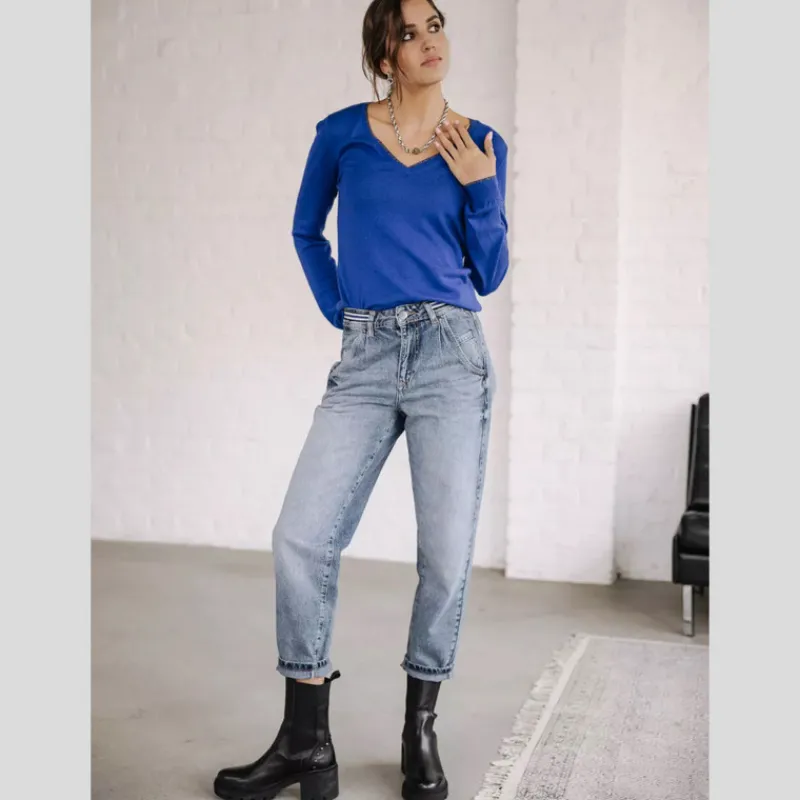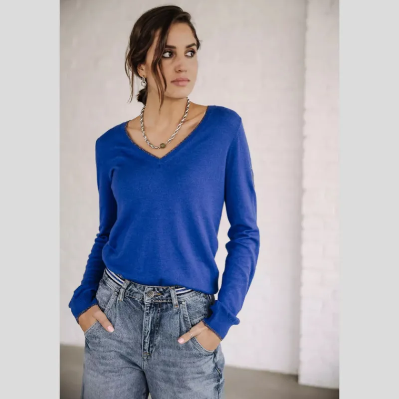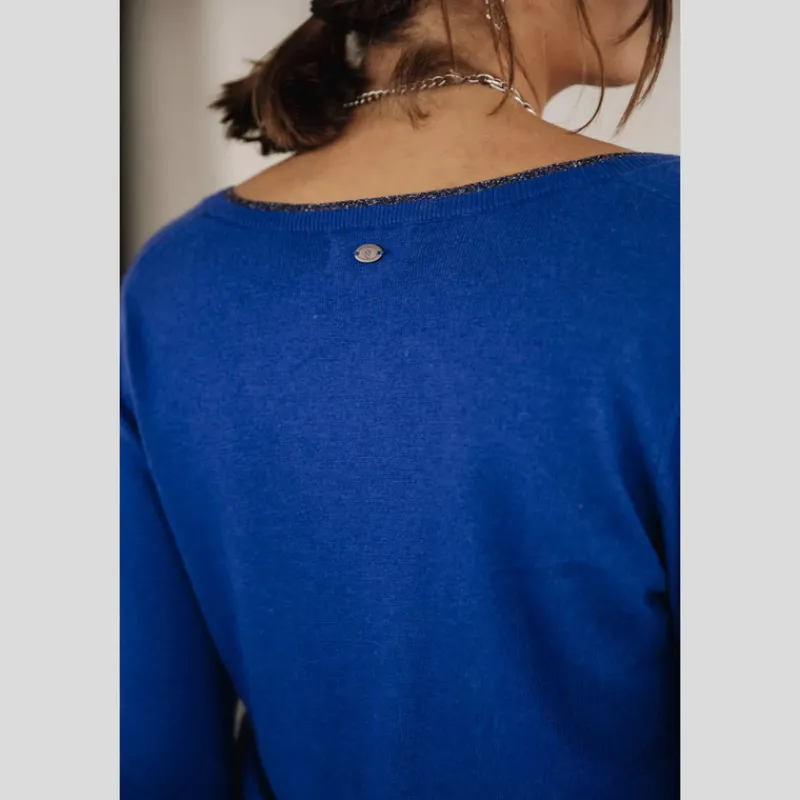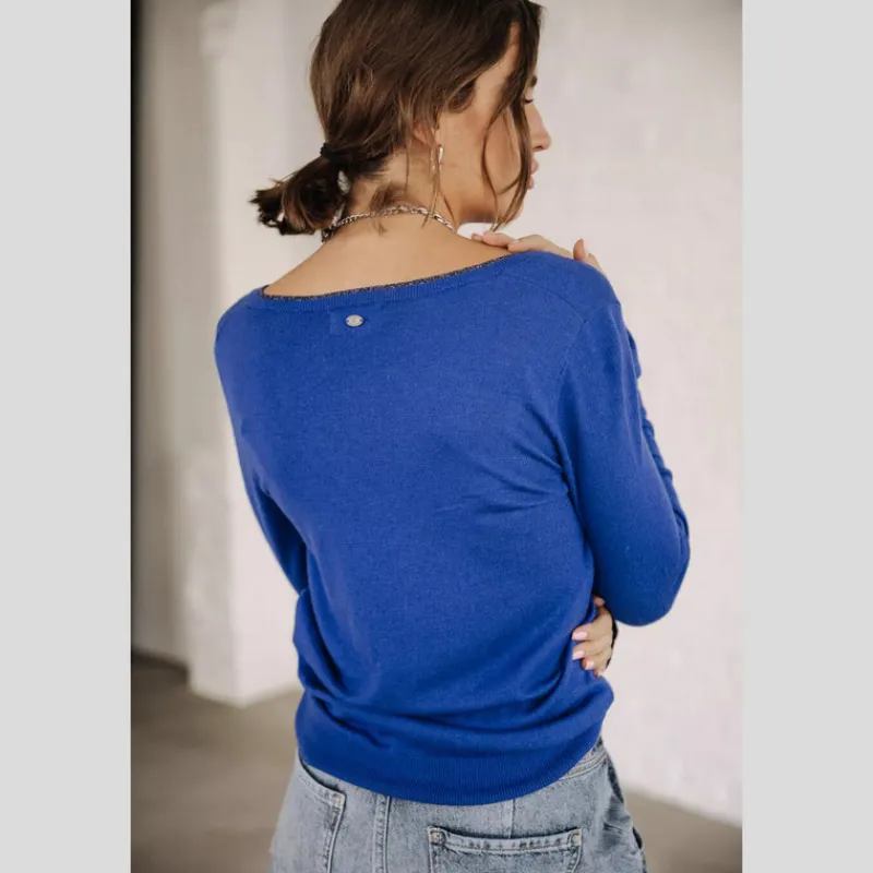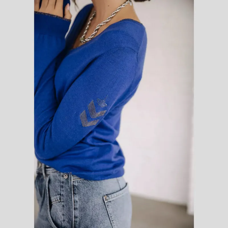 Jersey en Pico PREEM de FREEMAN T.PORTER en punto liso y suave mezcla de lana color AZULÓN. Lleva cuello en V, manga larga, cuello bajos y puño en canalé con pequeño ribete en lurex. Detalle de icono en cadena metálica fina en el brazo y marca en estrás.