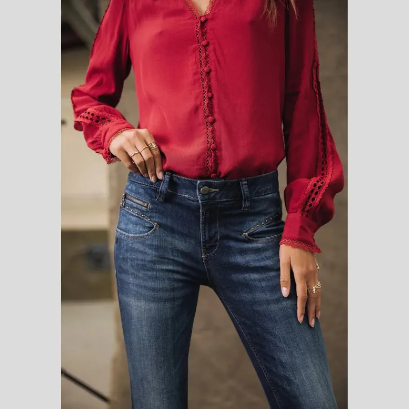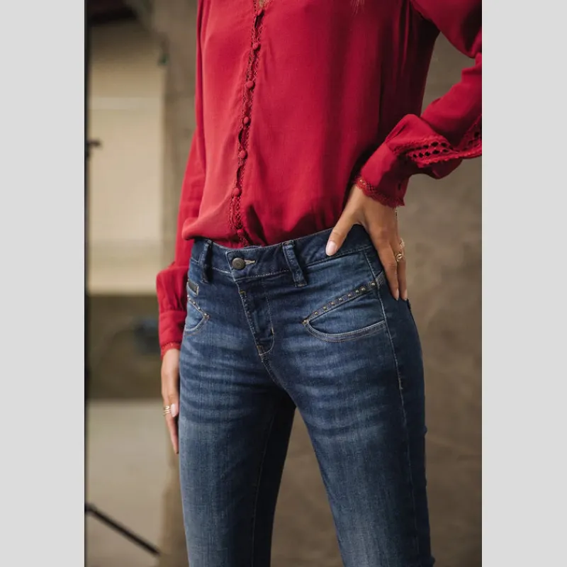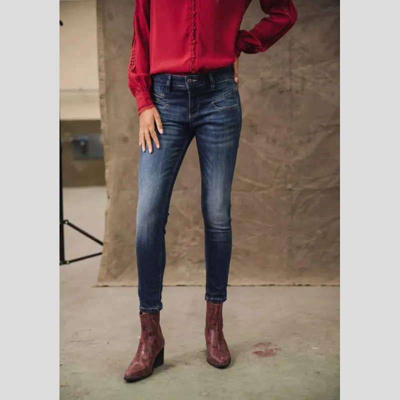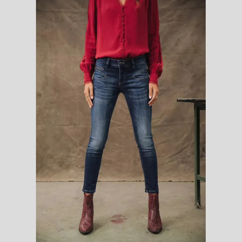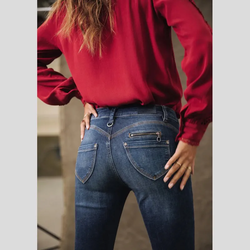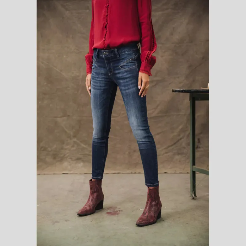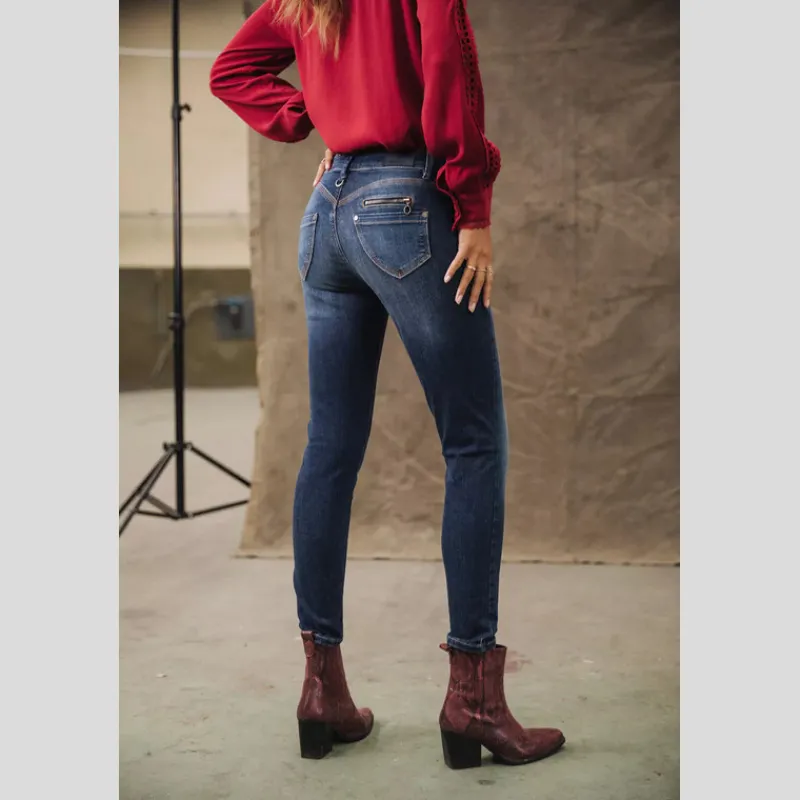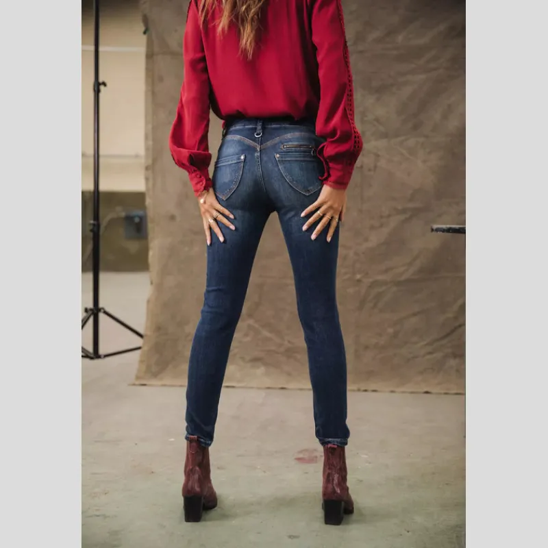 Vaquero ALEXA corte cropped de FREEMAN T.PORTER en denim superelástico color AZUL FEVER. Corte entallado.Cintura regular. Cremalleras y tachuelas de fantasía en los bolsillos. Canesú trasero en forma de corazón que realza las nalgas.Tachuelas de fantasía.