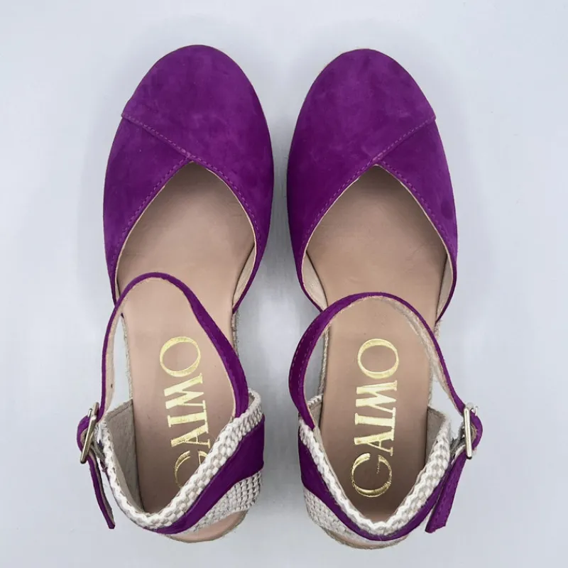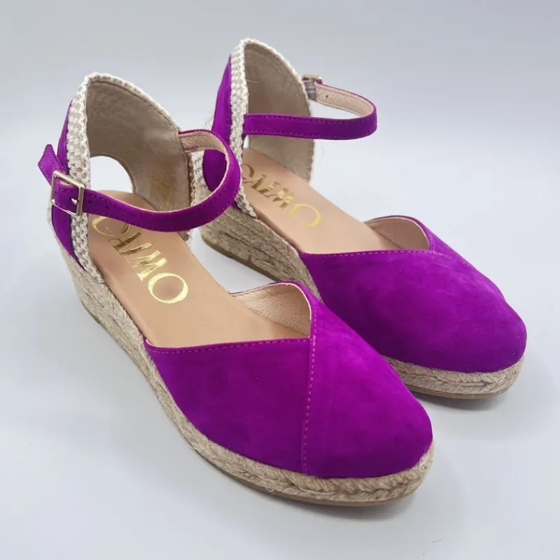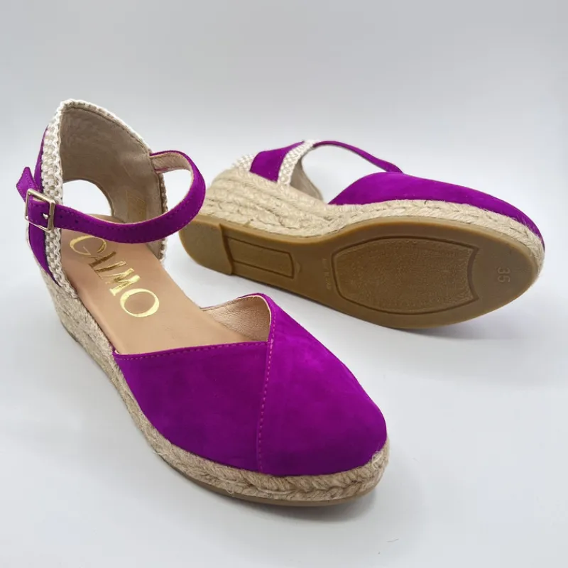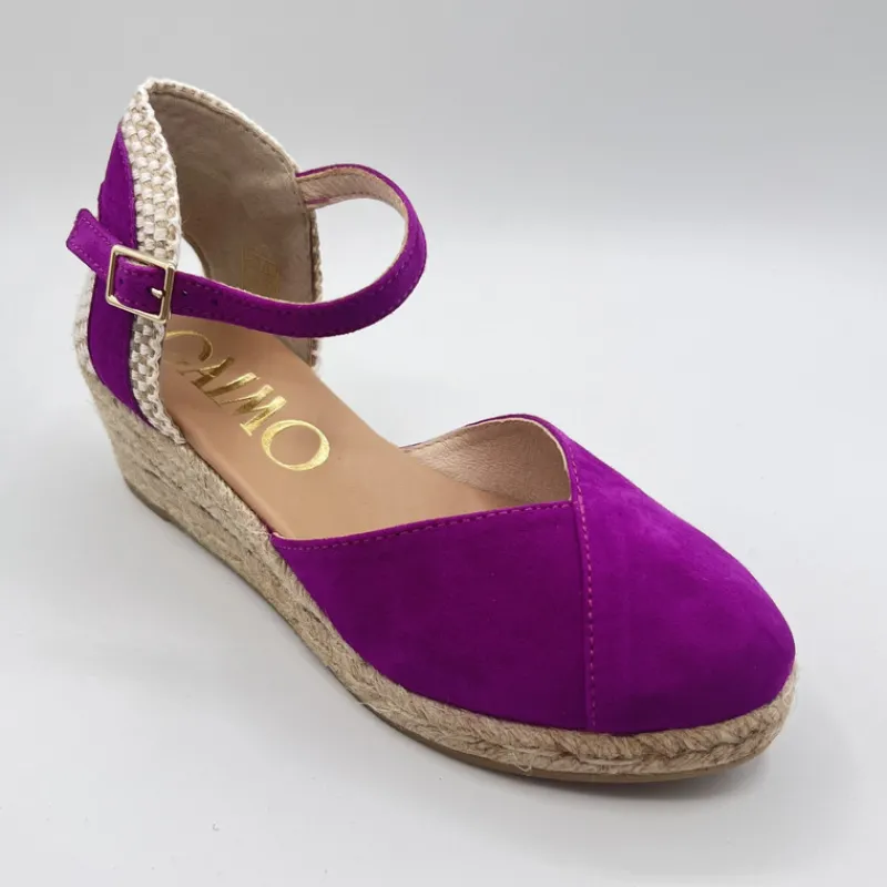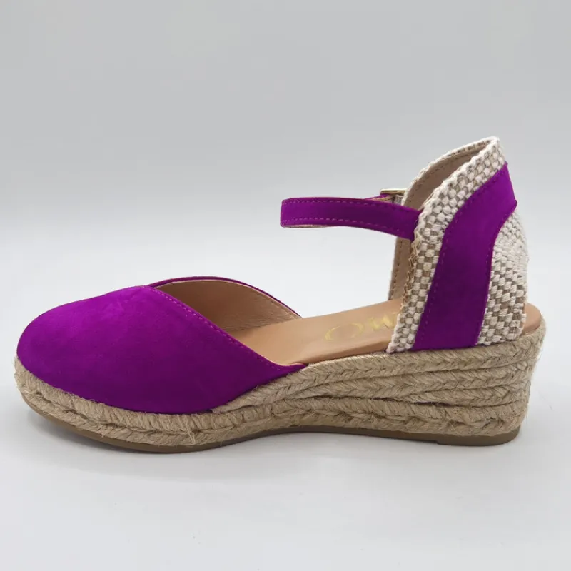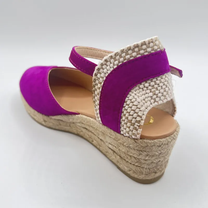 Alpargata con Cuña Baja de GAIMO en ANTE color FUCSIA OSCURO. Talonera semiabierta combinando esparto y ante con cierre tipo pulsera con hebilla. Puntera cerrada en ante estilo solapada con corte en forma de pico en el empeine. Suela de yute con goma.