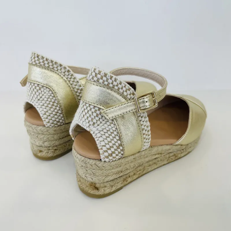 Alpargata con Cuña Baja de GAIMO en piel METALIZADA color ORO. Talonera semiabierta combinando esparto y piel con cierre tipo pulsera con hebilla. Puntera cerrada en piel estilo solapada con corte en forma de pico en el empeine. Suela de yute con goma.