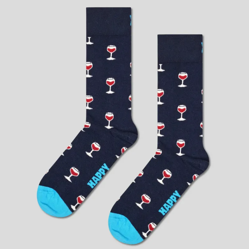 Caja de calcetines HAPPY SOCKS mezcla de algodón orgánico peinado modelo WINE GIFT SET 2-PACK con talón y dedo del pie reforzados. Esta caja contiene dos modelos en marino y rojo con estampados para los amantes del vino. ¿TOMAMOS UNA COPITA?