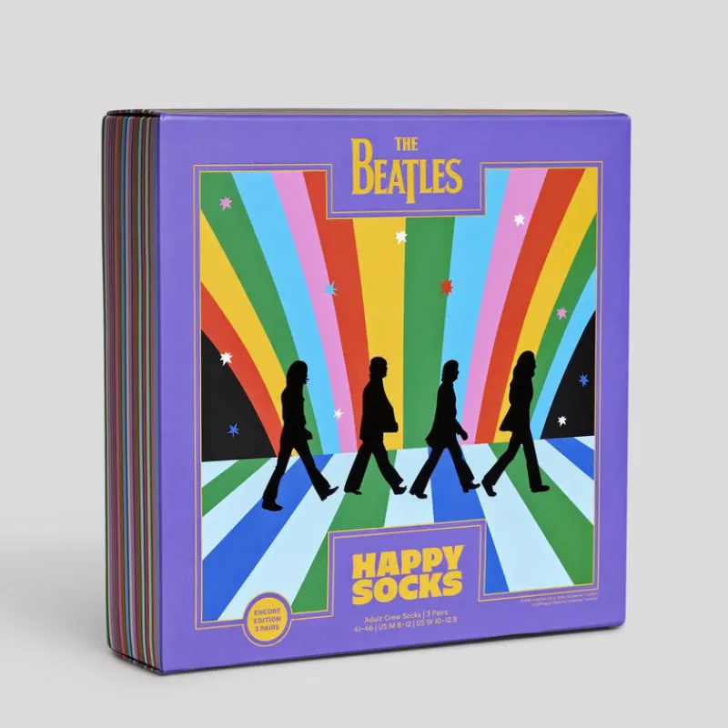 Caja EDICIÓN LIMITADA de calcetines HAPPY SOCKS de algodón peinado THE BEATLES 3 PACK GIFT BOX SET. Incluye 3 modelos únicos de calcetines de una de las bandas más míticas de la historia. Calcetines UNISEX en talla ÚNICA válidos para TALLA DEL 36/40.