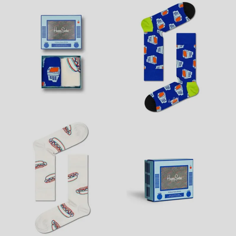 Caja de calcetines HAPPY SOCKS de algodón peinado modelo TV DINNER SOCKS GIFT BOX 2-PACK. Ver la TV ó comerse un perrito, esa es la cuestión. Calcetines UNISEX en talla ÚNICA válidos para TALLA DEL 41/46.