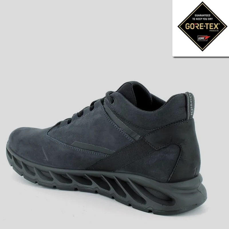 Semibotín deportivo con cordones de Hombre IGI&CO en Nobuk con refuerzos color MARINO con membrana interior de GORE-TEX. Suela de goma en cuña de 4 cm y sistema ShockAbsorber. Plantilla extraíble de piel con MemoryFoam. ¡MODELO SUPERLIGERO Y FLEXIBLE!