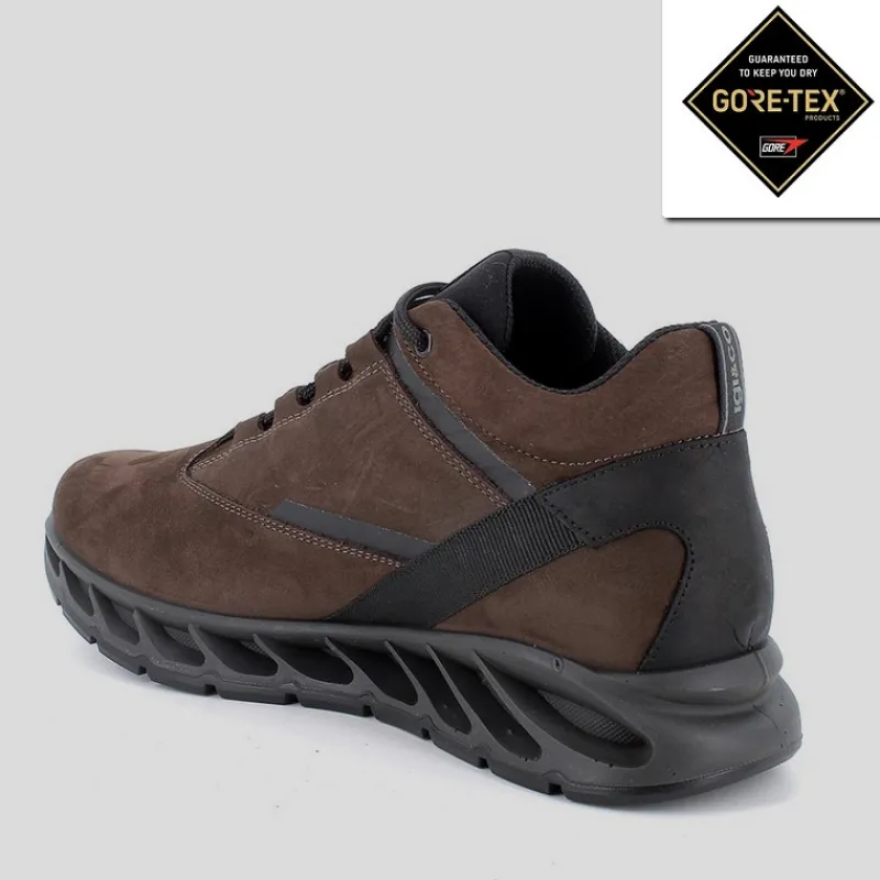 Semibotín deportivo con cordones de Hombre IGI&CO en Nobuk con refuerzos color MARRÓN con membrana interior de GORE-TEX. Suela de goma en cuña de 4 cm y sistema ShockAbsorber. Plantilla extraíble de piel con MemoryFoam. ¡MODELO SUPERLIGERO Y FLEXIBLE!