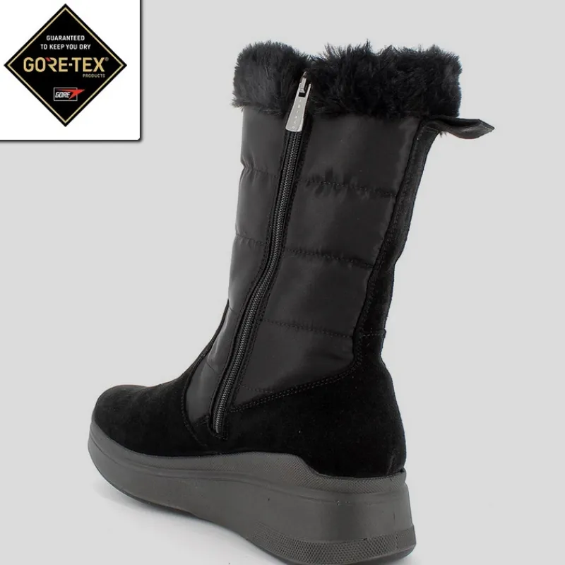 Bota Mujer IGI&CO en Nailon Técnico color NEGRO combinado con ante al tono. Membrana interior de GORE-TEX con FORRO POLAR. Diseño Aprés Ski con pelo en la parte superior, perfectas para FRÍO y AGUA. Ajuste por cremallera. Suela con cuña media de 4,5.
