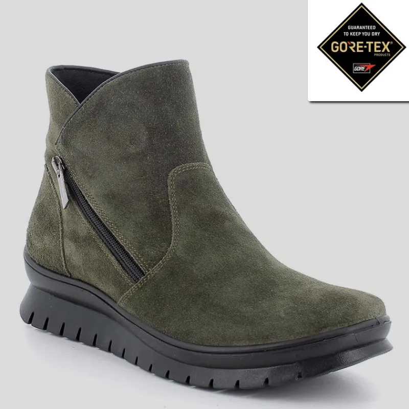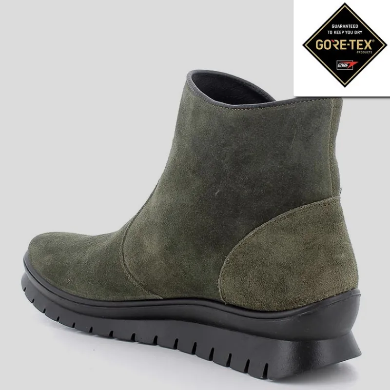 Botín de mujer IGI&CO de cuña baja en ante color VERDE. Membrana interior de GORE-TEX que la hace totalmente impermeable y transpirable. Cierre por cremallera lateral y suela de goma antideslizante, amortiguada y flexible. Dispone de PLANTILLA EXTRAÍBLE.