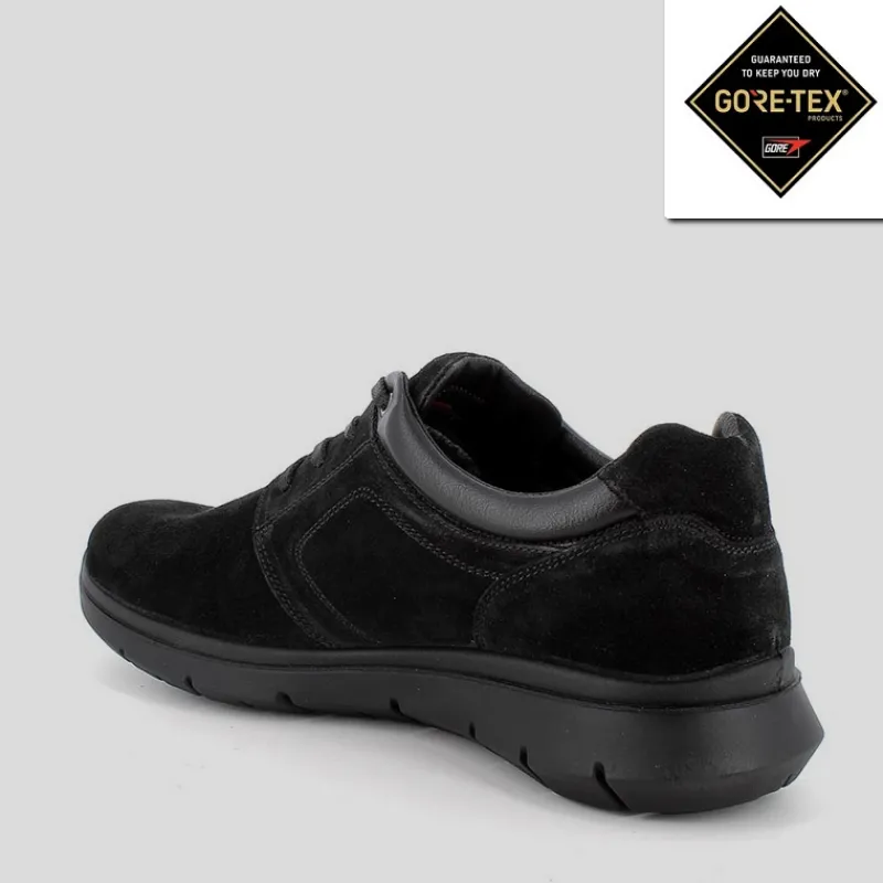 Blucher deportivo de Hombre IGI&CO confeccionado en ante color NEGRO con membrana interior de GORE-TEX. Dispone de plantilla MEMORY FOAM de piel EXTRAÍBLE. Cierre por cordones. Suela de goma flexíble y amortiguada. Detalle de piel negra en los tobillos.