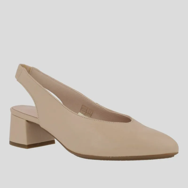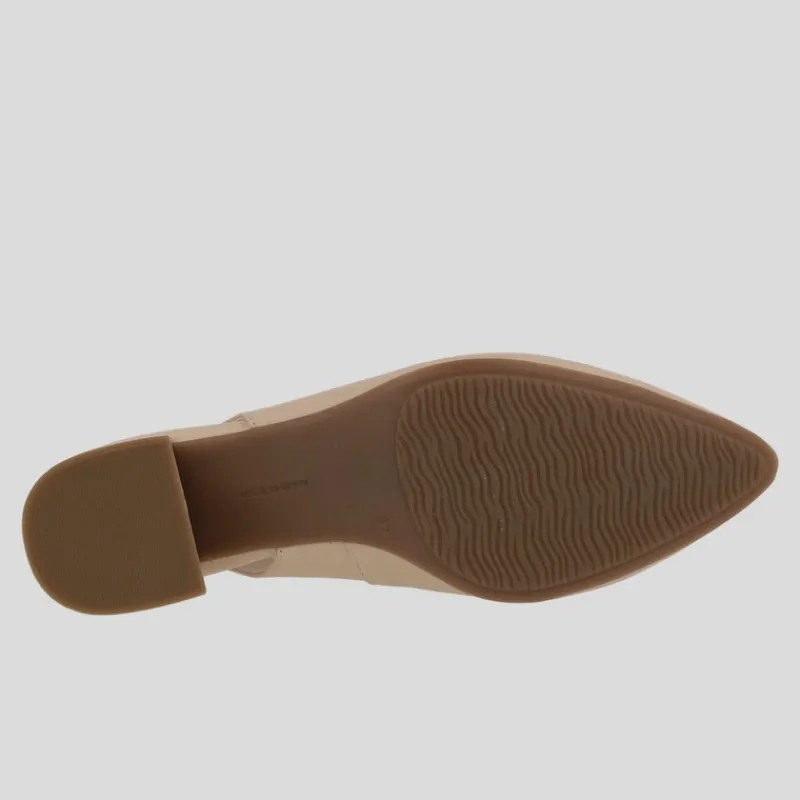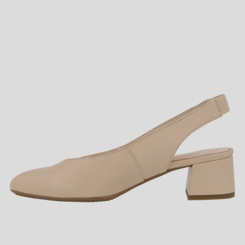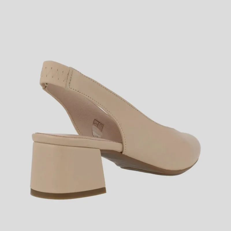 Salón destalonado NE.KA.NE fabricado en piel lisa color BEIGE con plantilla interior de piel acolchada y suela de goma antideslizante. Lleva tacón medio de 5 cm forrado en piel al tono. Acabado en punta con tira de talón con ajuste elástico al tono.