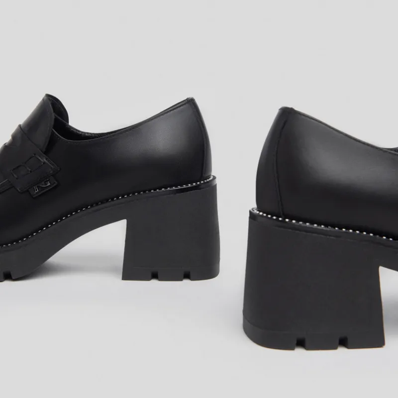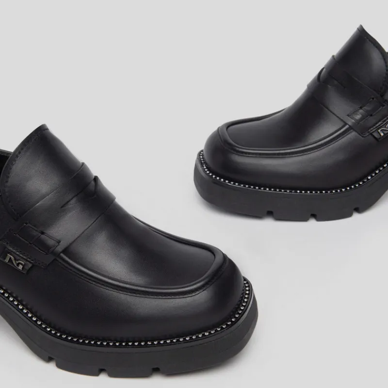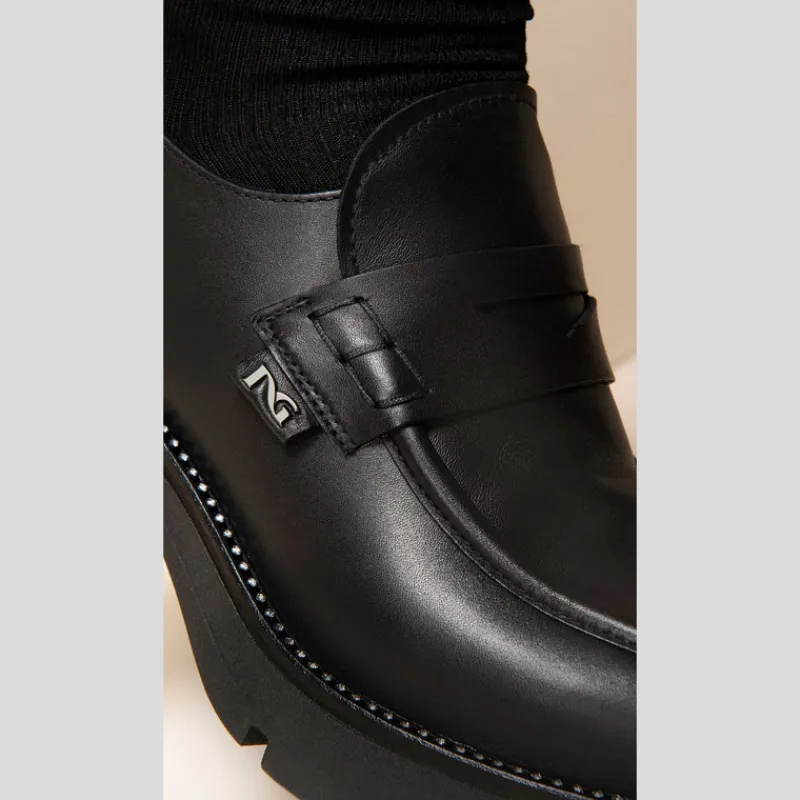 Mocasín de NERO GIARDINI en piel color NEGRO de corte clásico con suela de goma gorda y tacón block antideslizante de 6cm decorado con tachas de pedrería en el perfil de la suela. Puntera redonda. Plantilla de piel acolchada.