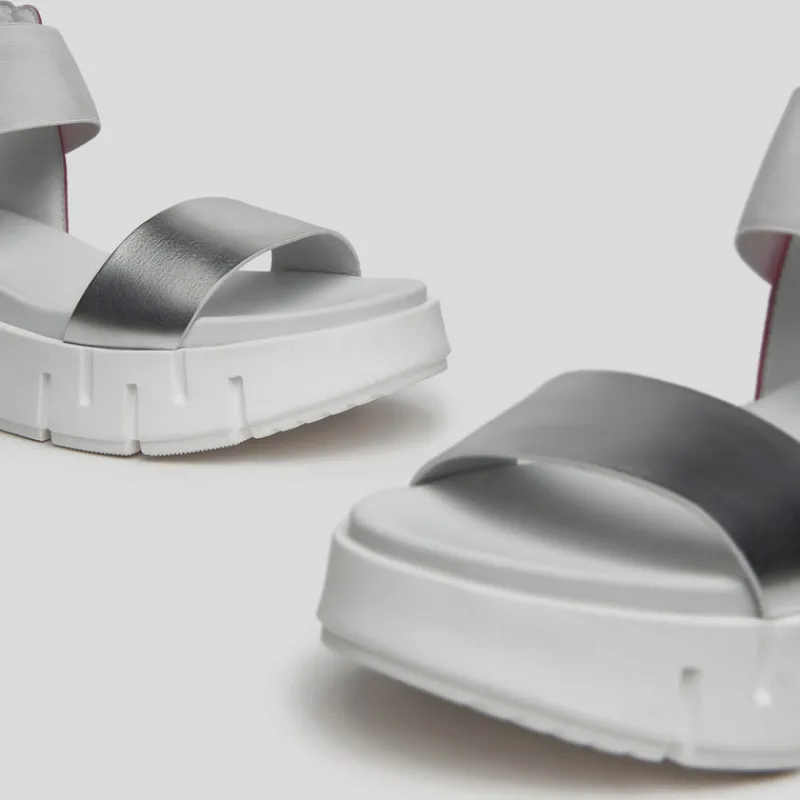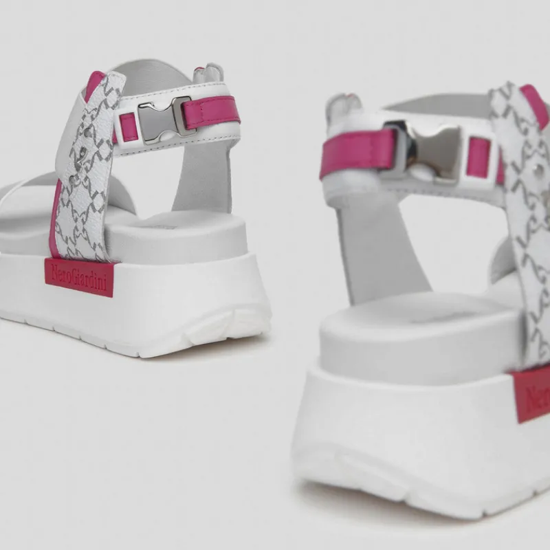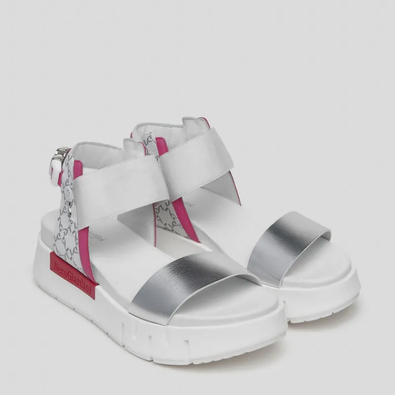 Sandalia de NERO GIARDINI fabricada en combinación de piel espejo PLATA con aplicaciones de piel gragada con LOGOS en contraste. Banda elástica FUCSIA y correa en el tobillo con hebilla decorativa y detalles de piel en blanco. Plataforma de goma de 4 cm.