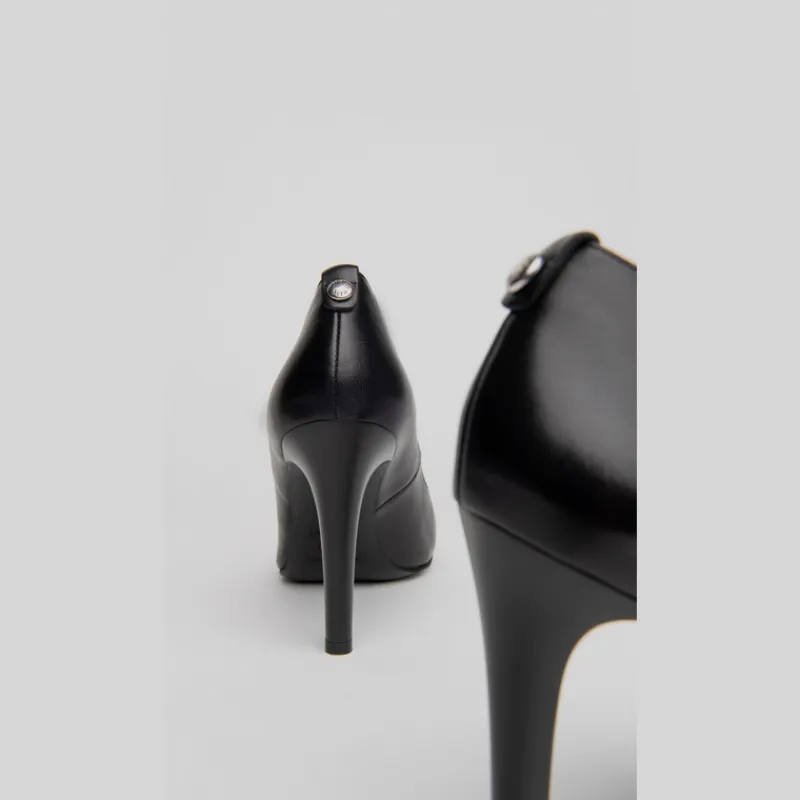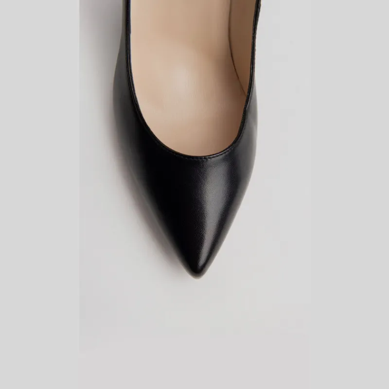 Salón Stiletto de NERO GIARDINI fabricado en piel napa lisa color NEGRO. Puntera afilada y talón recogido con logo metálico trasero. Tacón de 9,5 cm. Plantilla de piel acolchada. Suela de goma con logo tricolor.