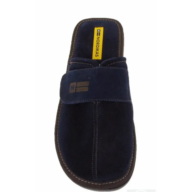 Zapatillas de casa NORDIKAS de hombre modelo 375 AFELPADO color MARINO abiertas por detras. Fabricada en ante con cierre de velcro en el empeine para un ajuste a medida. Forro textil, suave y transpirable. Suela de goma antideslizante y absorbe impactos.