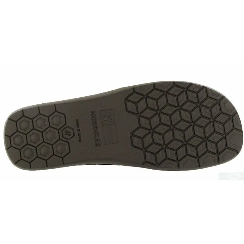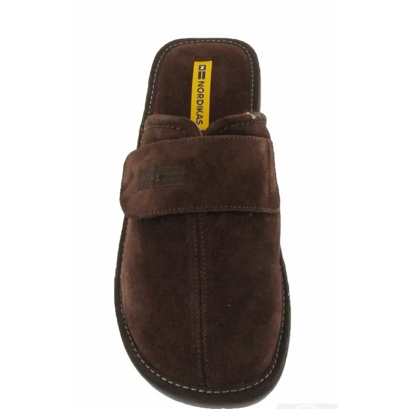 Zapatillas de casa NORDIKAS de hombre modelo 375 AFELPADO color MOKA abiertas por detras. Fabricada en ante con cierre de velcro en el empeine para un ajuste a medida. Forro textil, suave y transpirable. Suela de goma antideslizante y absorbe impactos.