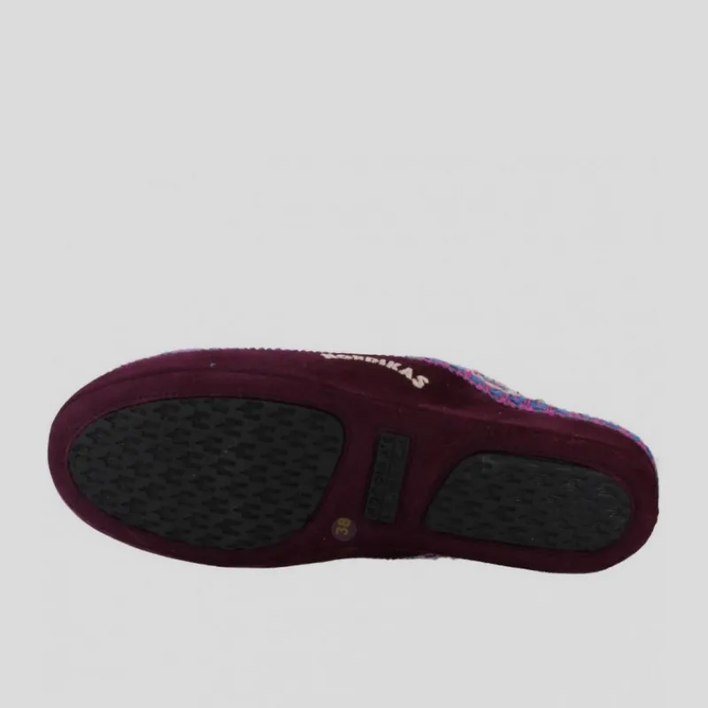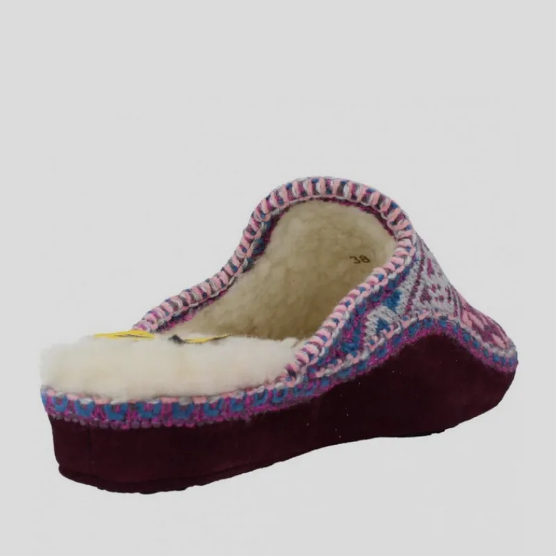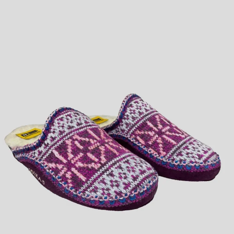 Zapatilla de casa NORDIKAS de mujer modelo 1500 TEIDE color MORADO abiertas por detras. Fabricada con lana de alta calidad 100% natural. Forrada en su interior para proporcionar mayor calidez. Suela de goma antideslizante y aislante del frío. Cuña 3cm.