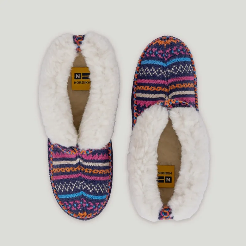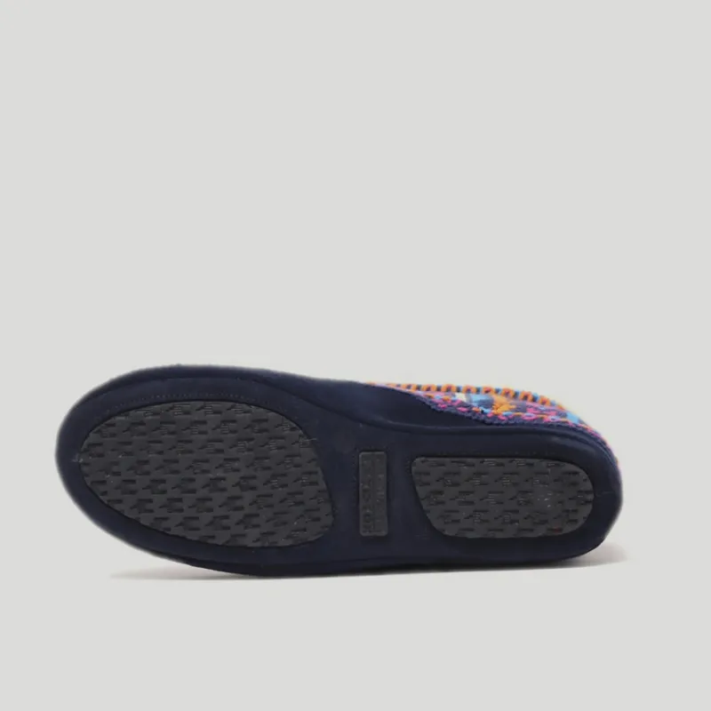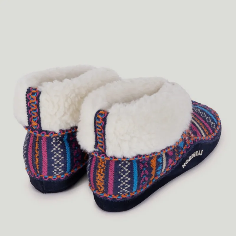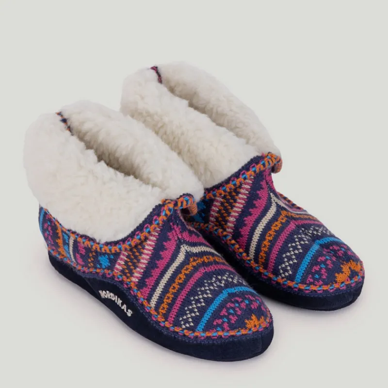 Zapatillas de casa NORDIKAS de mujer modelo 3600 CANDANCHU grecas color MARINO. Zapatilla abotinada de lana con forro de borreguito con una solapa que se puede subir para abrigar el tobillo. Piso combinado de serraje con goma, ligero y antideslizante.