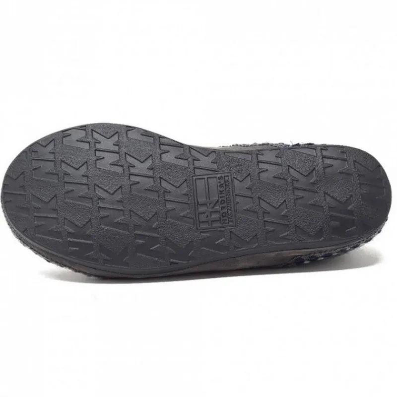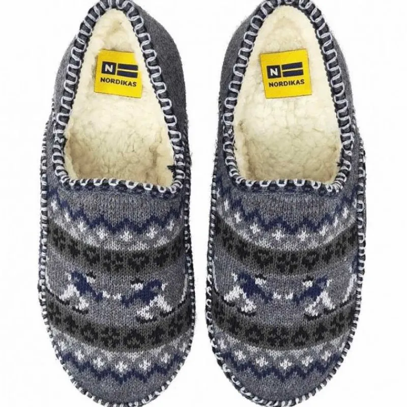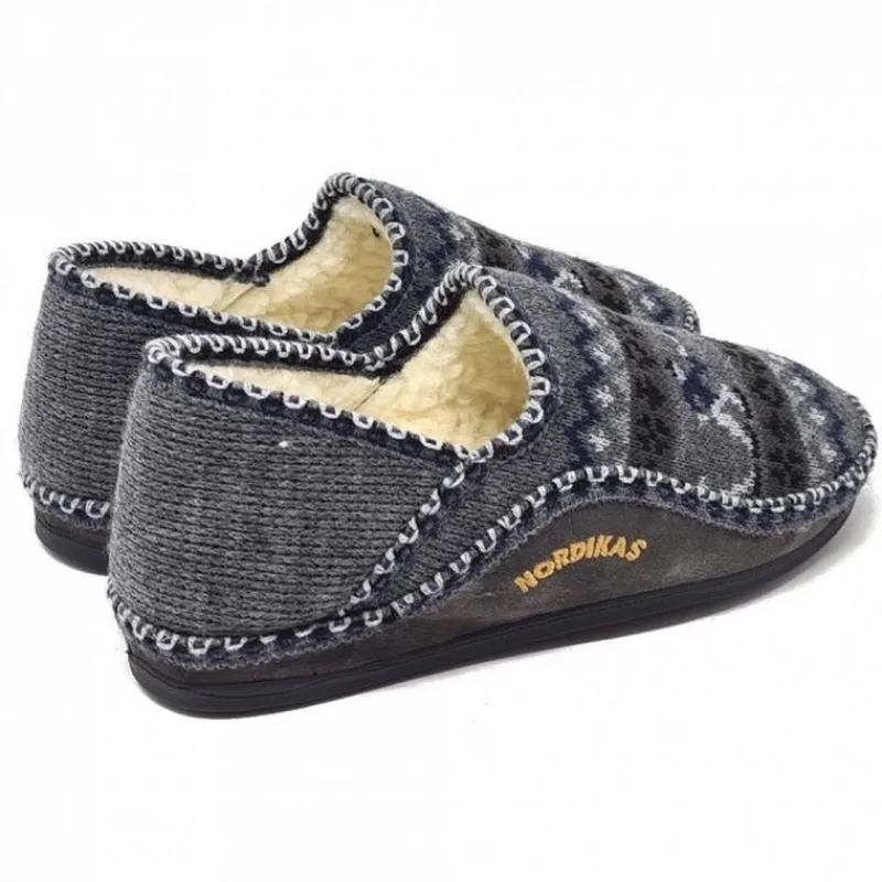 Zapatillas de casa NORDIKAS de HOMBRE modelo 3002 PATINADOR color GRIS cerradas por detras. Realizada en punto tricot con dibujo. Forrada en su interior para proporcionar mayor calidez. Suela de goma antideslizante y aislante del frío. Cuña 3cm.