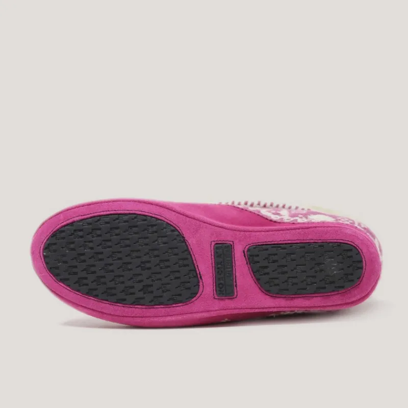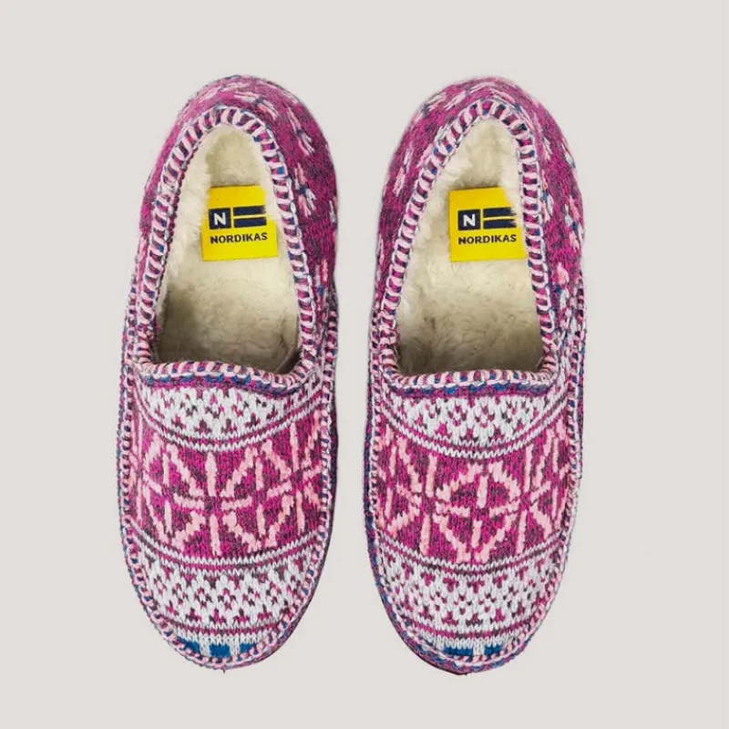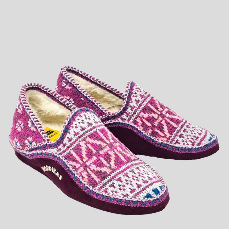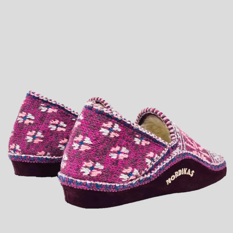 Zapatilla de casa NORDIKAS de mujer modelo 2000 TEIDE color MORADO cerradas por detras. Fabricada con lana de alta calidad 100% natural. Forrada en su interior para proporcionar mayor calidez. Suela de goma antideslizante y aislante del frío. Cuña 3cm.