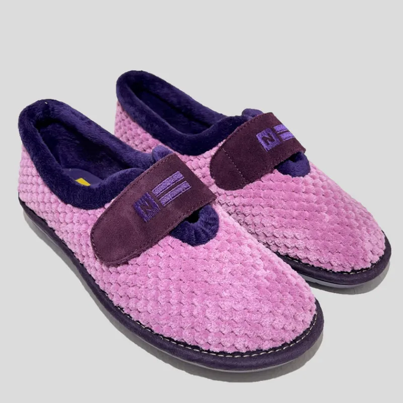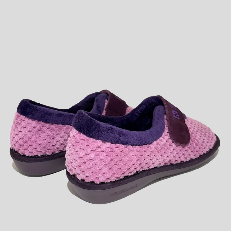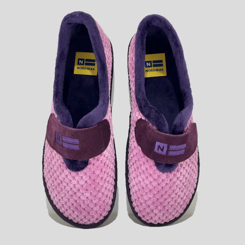 Zapatillas de casa NORDIKAS de mujer modelo TOP LINE 7396/4 ANDES MALVA. Ajuste por velcro, cerradas por detrás. Fabricada en tejido acolchado y aterciopelado para una mayor calidez. Suela de goma antideslizante y aislante del frío. Cuña 3cm.