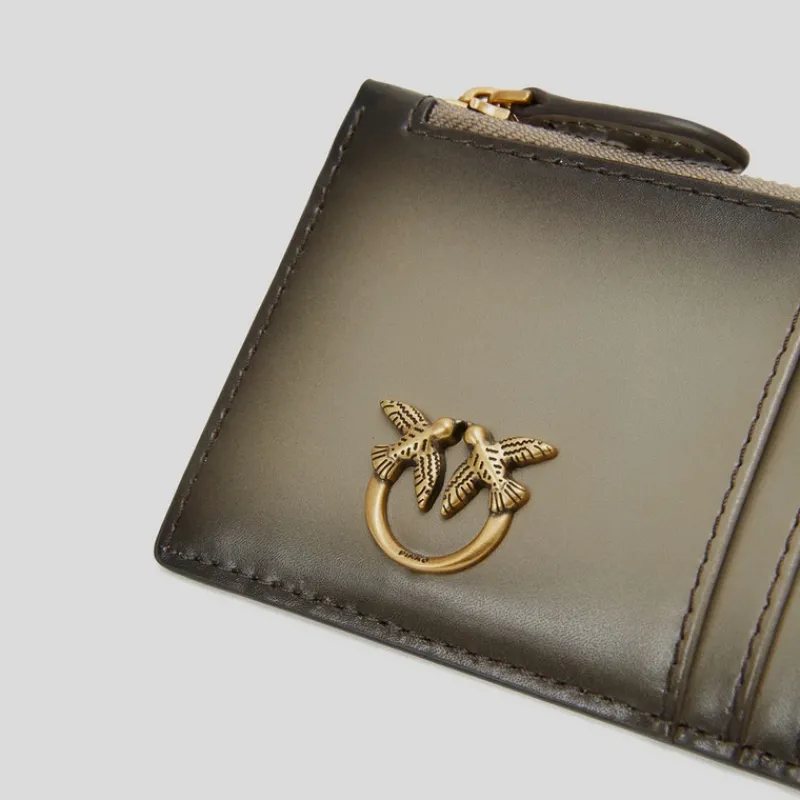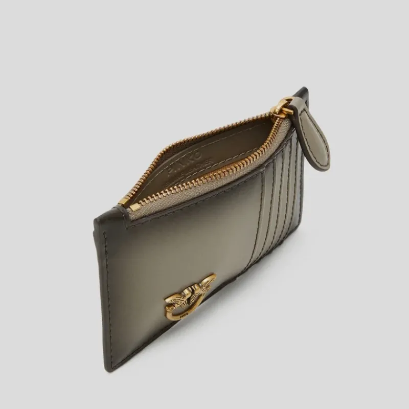 Cartera Tarjetero Airone de PINKO fabricado en piel suave color GRIS con efecto degradado en oscuro por los bordes y adornado con placa de metal con logotipo Love Birds Diamond Cut. Cierre con cremallera. El interior está forrado de polialgodón.