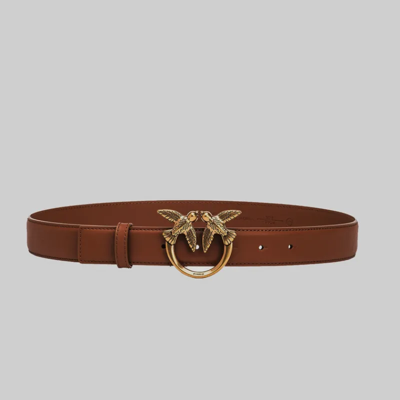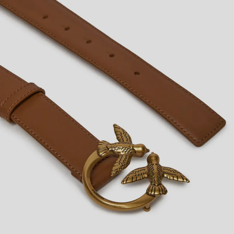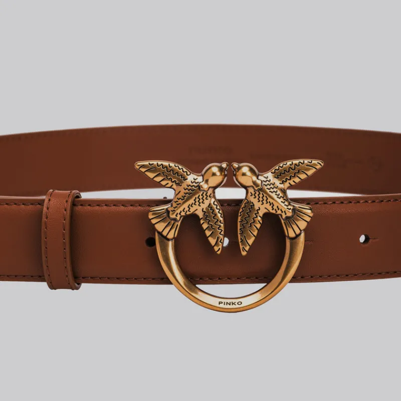 Cinturón de PINKO de piel lisa color MARRÓN con tacto de seda y hebilla LOVE BIRDS DIAMOND CUT de metal, galvanizada en ORO ENVEJECIDO. Este cinturón tiene una anchura de 3cm.