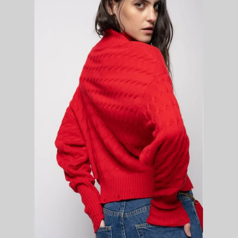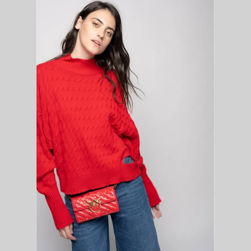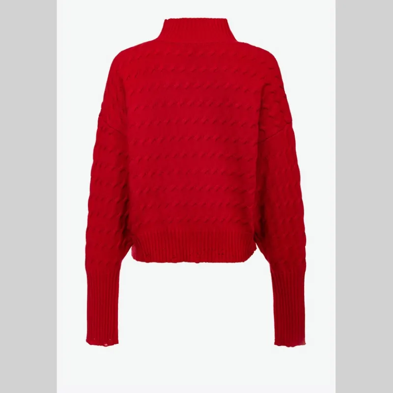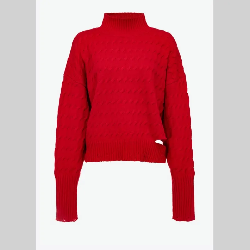 Jersey dolcevita de PINKO con manga larga, en hilo de algodón, lana y cachemira, con efecto trenzado horizontal color ROJO. Cuello a la caja, puños altos y bajo de la prenda con detalle de cut-out lateral y con elaboración acanalada.