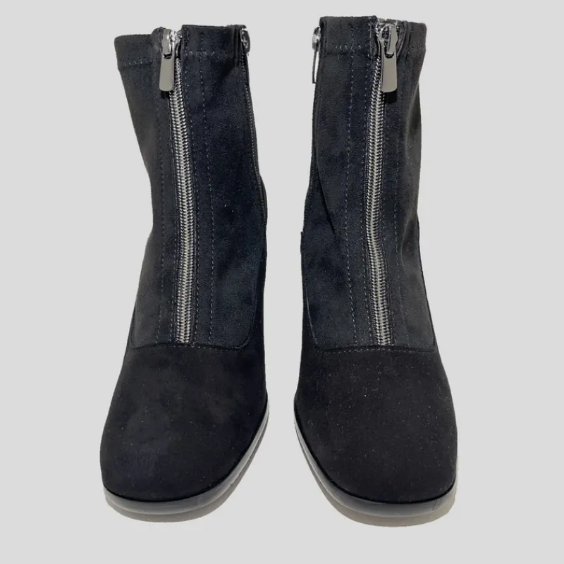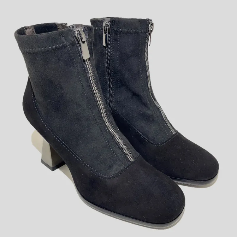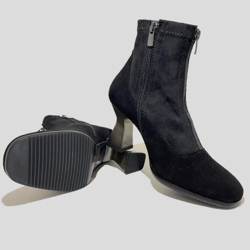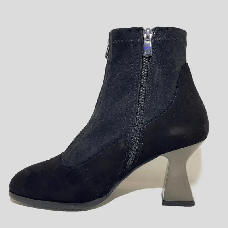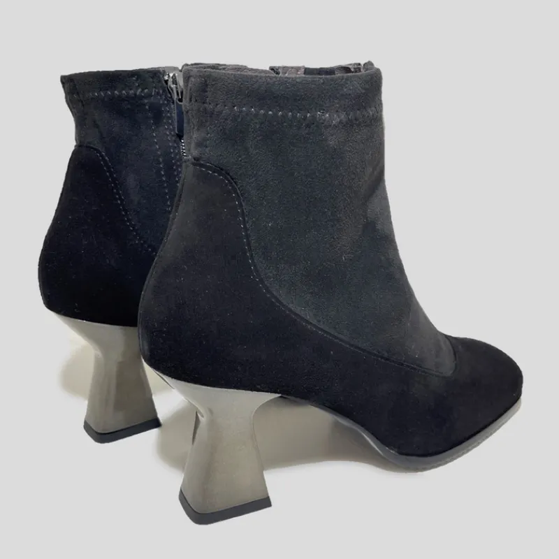 Botín de PLUMERS en ante NEGRO combinado con licra de antelina NEGRA en la caña. Puntera redonda y cremallera frontal decorativa. Cierre por cremallera lateral. Tacón de 7 cm piramidal estilo copa en contraste metalizado GRIS. Plantilla piel acolchada.