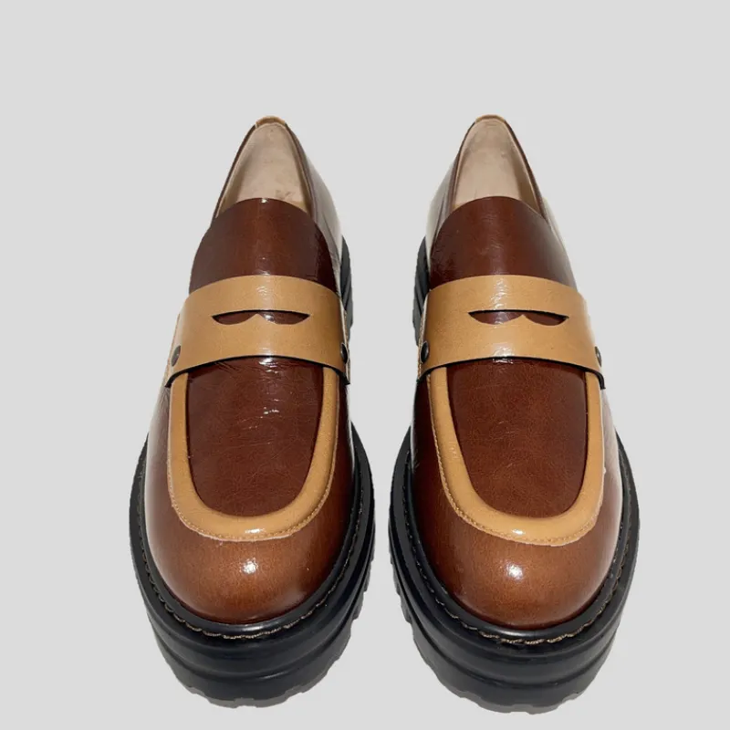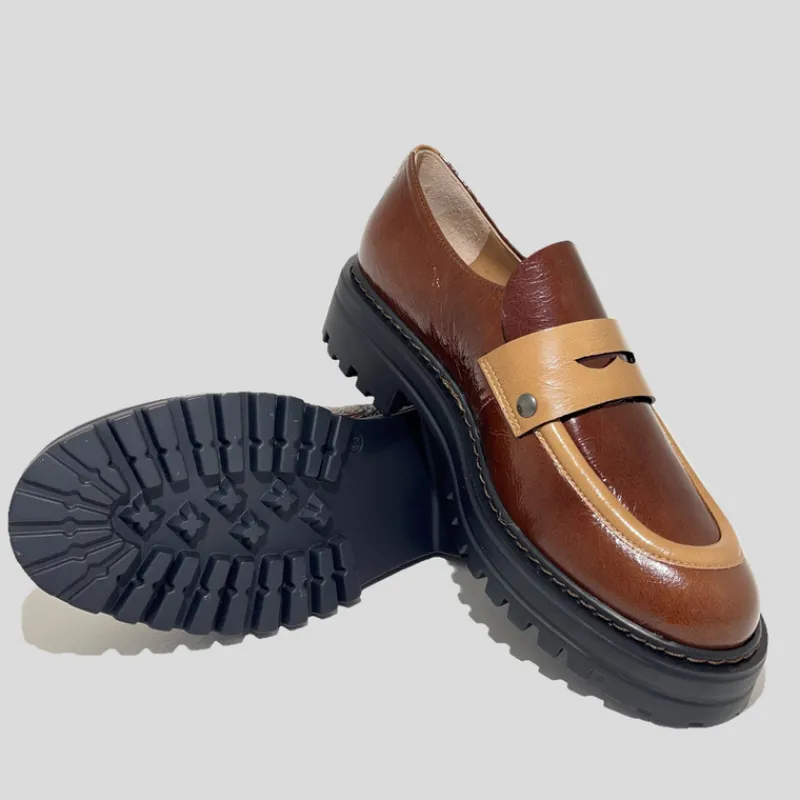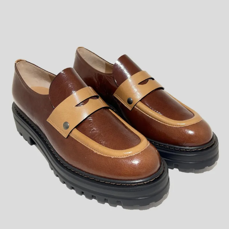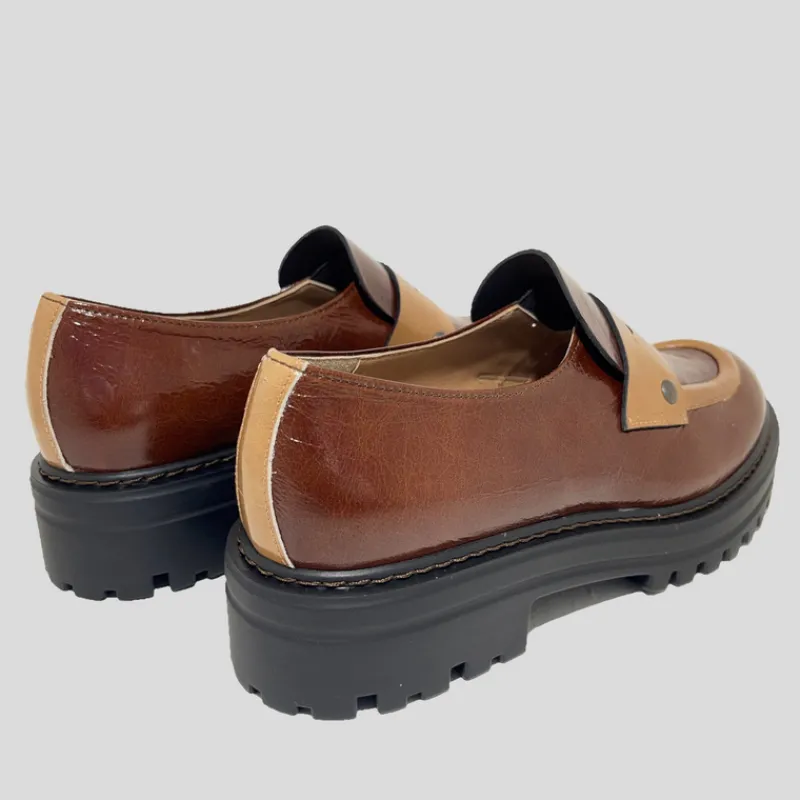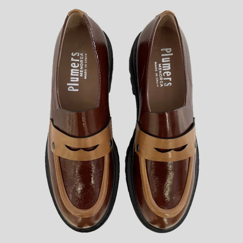 Mocasín plano de PLUMERS en piel brillo acharolada color MARRÓN con detalles de antifaz y ribete en BEIGE. Suela gorda de goma estilo track con pespuntes a la vista que le da un aire urbano y moderno. Plantilla interior de piel acolchada.