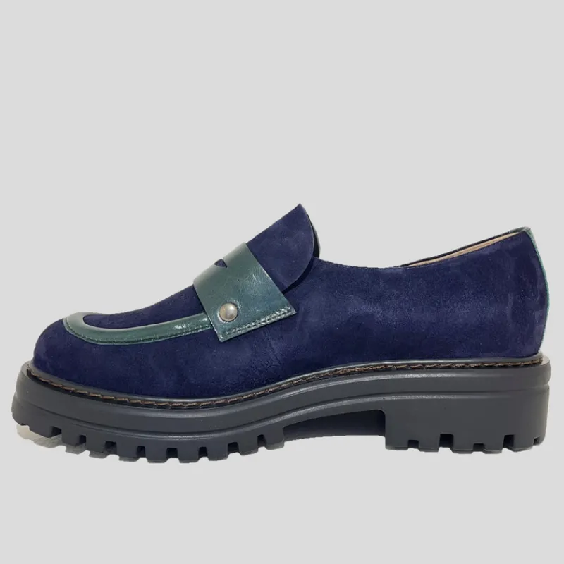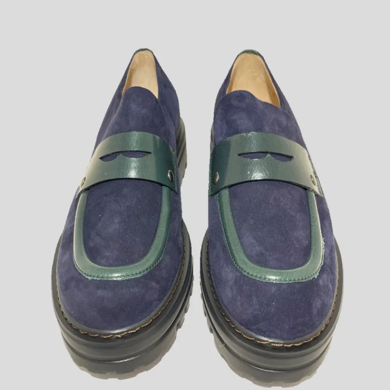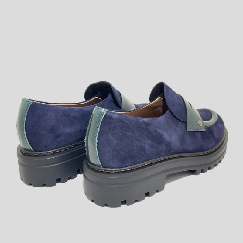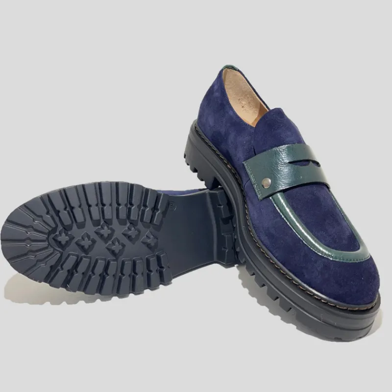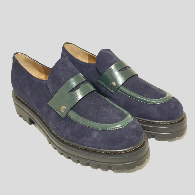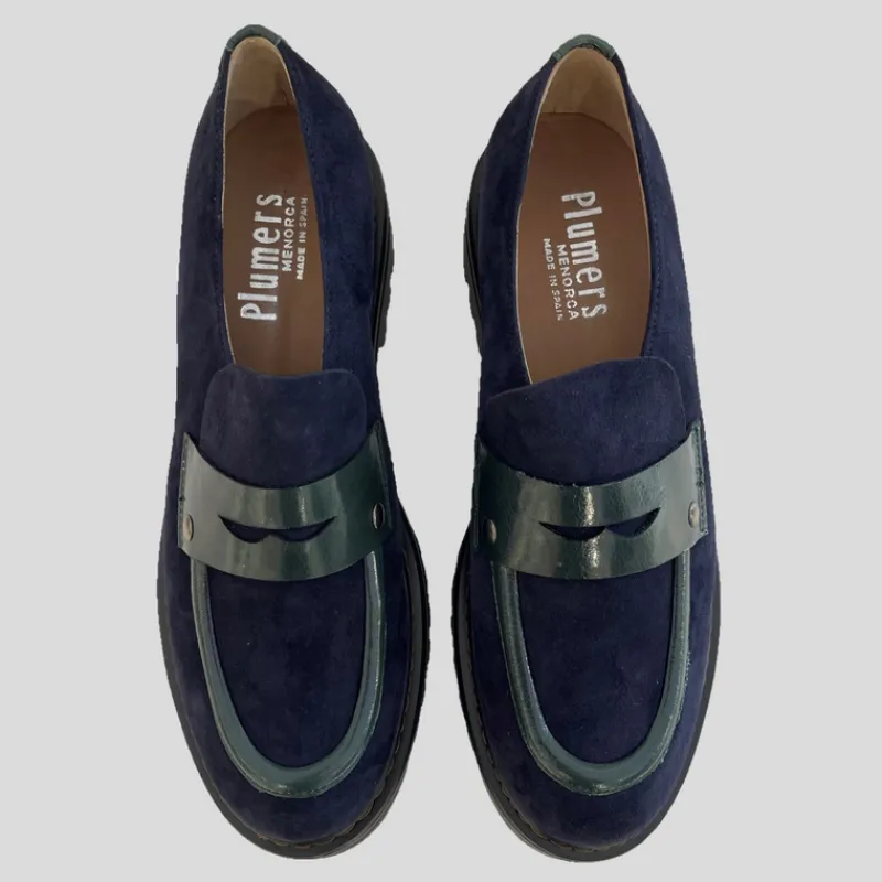 Mocasín plano de PLUMERS fabricado combinando piel ante color MARINO con detalles en piel acharolada VERDE. Suela gorda de goma estilo track con pespuntes a la vista que le da un aire urbano y moderno. Plantilla interior de piel acolchada.