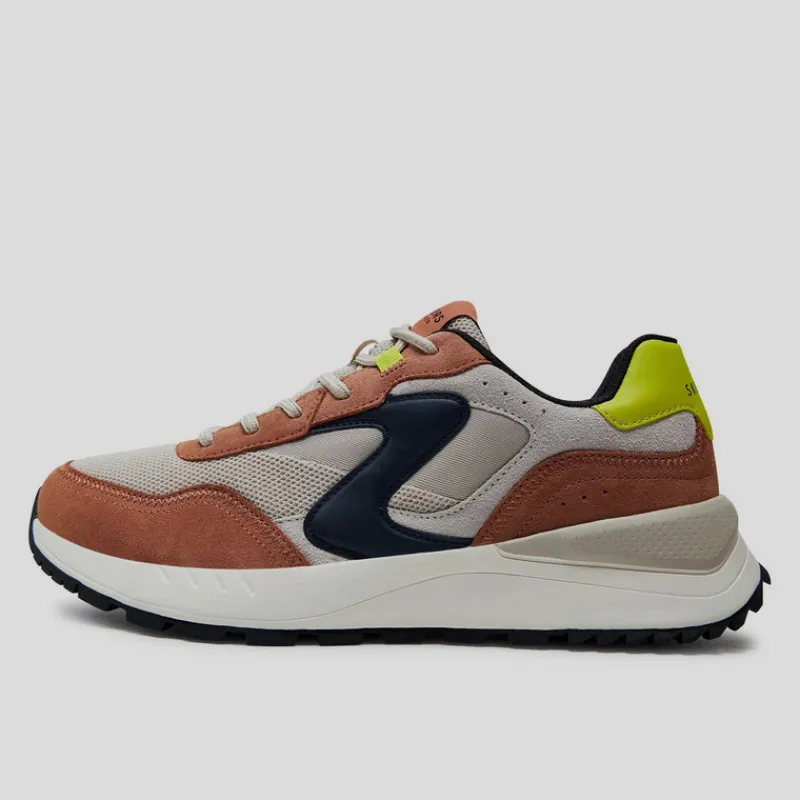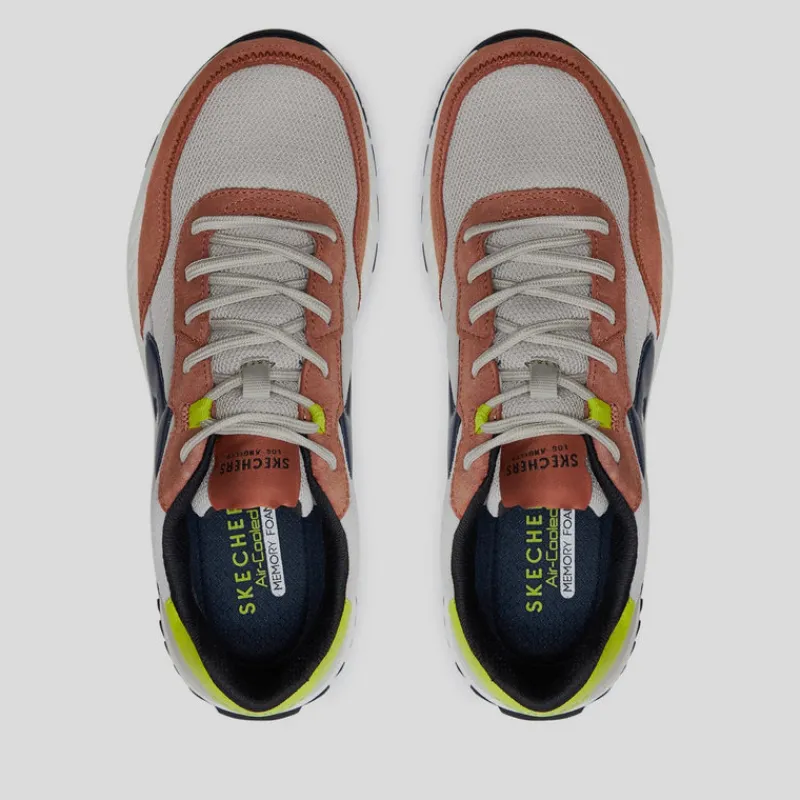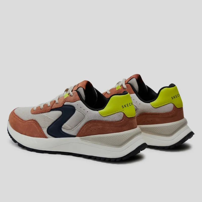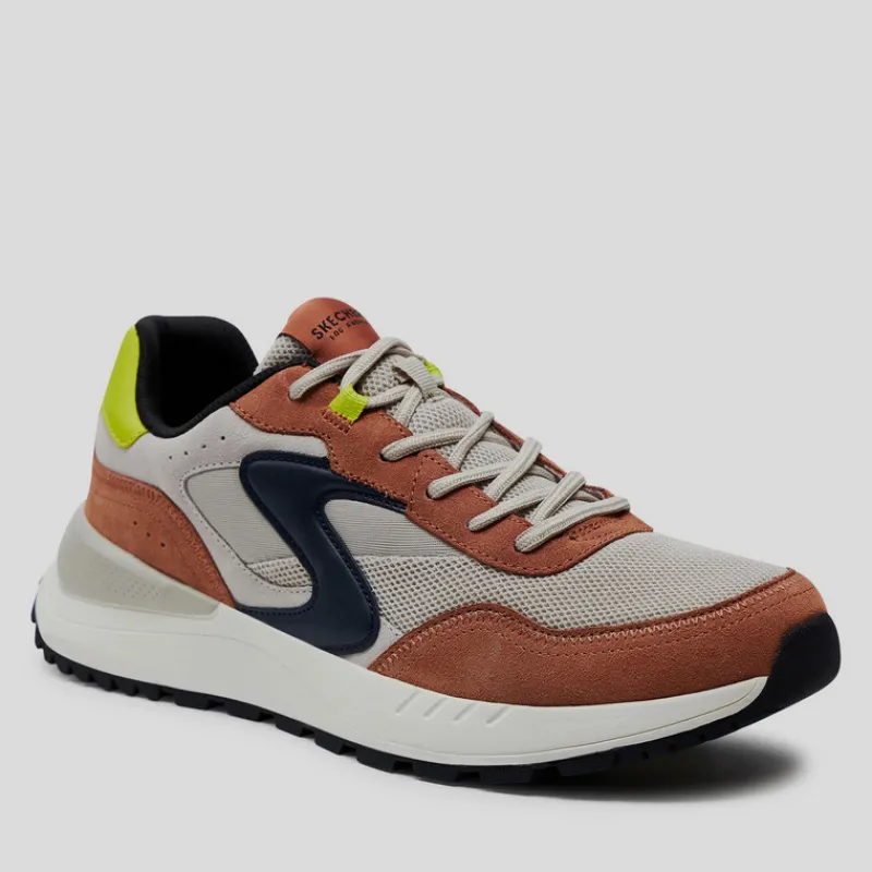 Deportiva estilo retro de Hombre SKECHERS modelo FURY- FURY LACE LOW que combina parte superior de malla multicapa con ante y piel en colores NATURAL, MOKA, MARINO y AMARILLO. Media suela con amortiguación y plantilla Skechers Air-Cooled Memory Foam®.