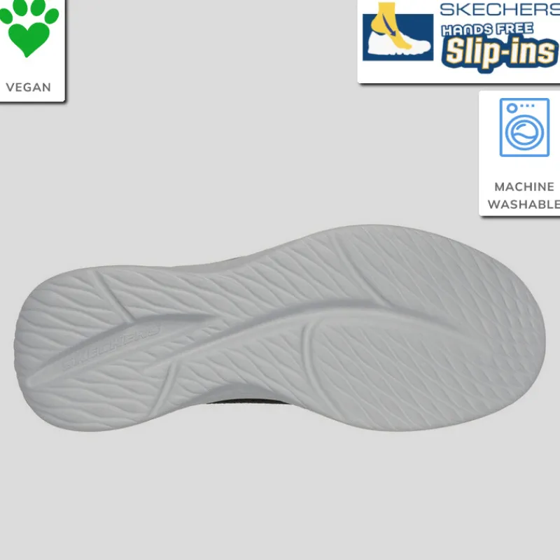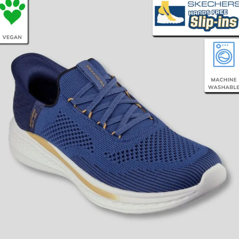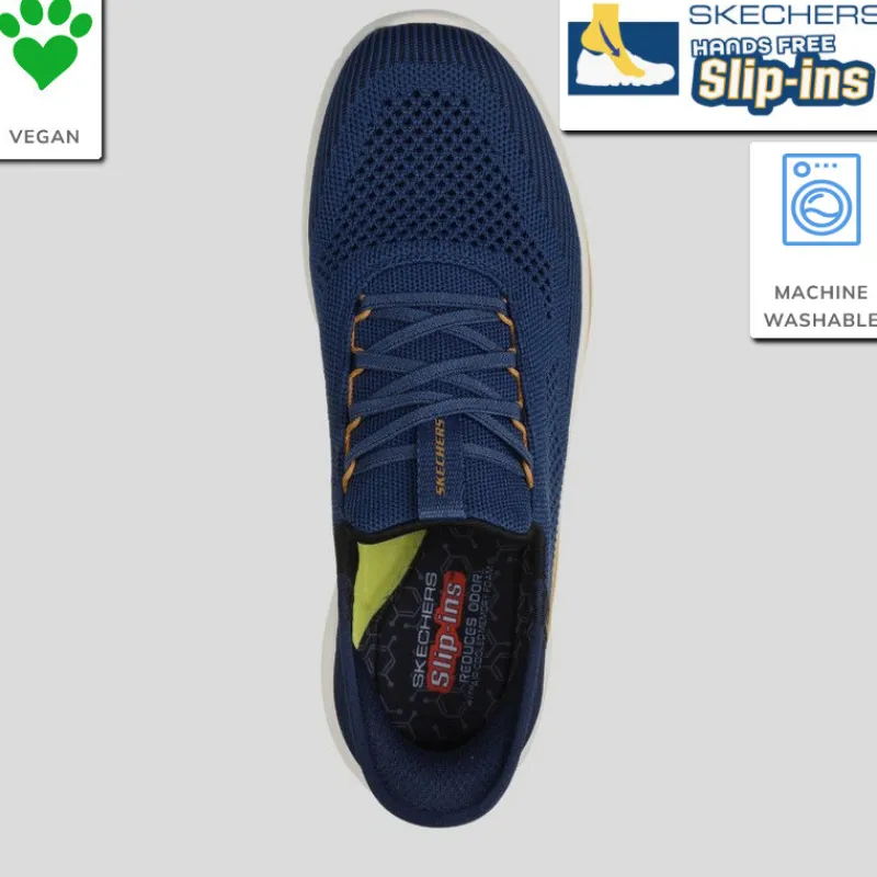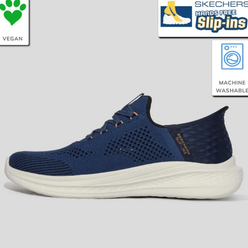 Deportiva vegana de Hombre SKECHERS SLIPS-INS modelo Relaxed Fit®: SLADE-QUINTO color AZUL. Exclusiva talonera HEEL PILLOW™ para ponerse la deportiva sin usar las manos «HANDS FREE». Parte superior de tejido knit técnico transpirable. Cordones elásticos.
