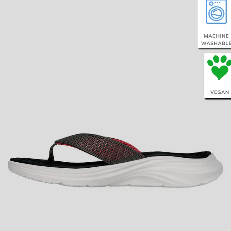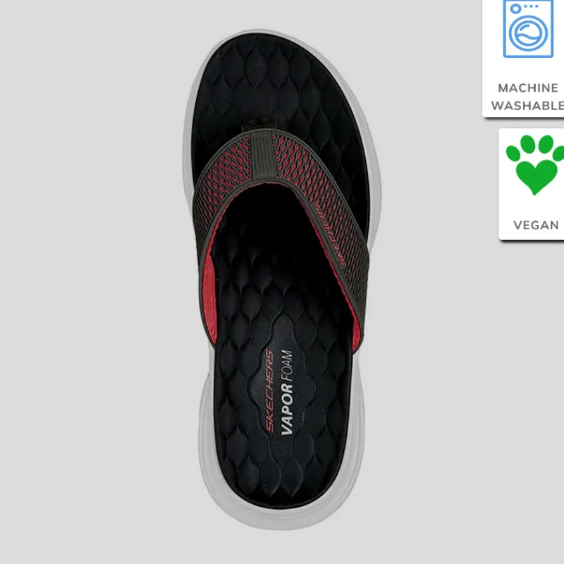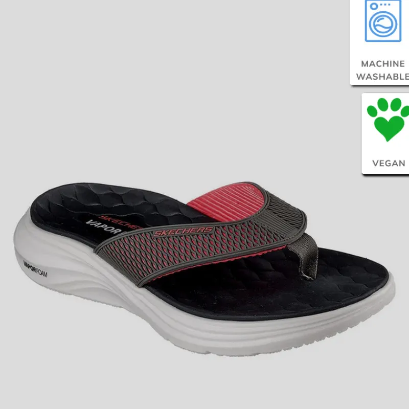 Sandalia de dedo Hombre SKECHERS estilo deportiva modelo VAPOR FOAM – SAYTO con parte superior acolchada en malla sintética KPU con forma de panal que combina colores NEGRO y ROJO. Suela de tracción flexible con amortiguación ultraligera VAPOR FOAM™.